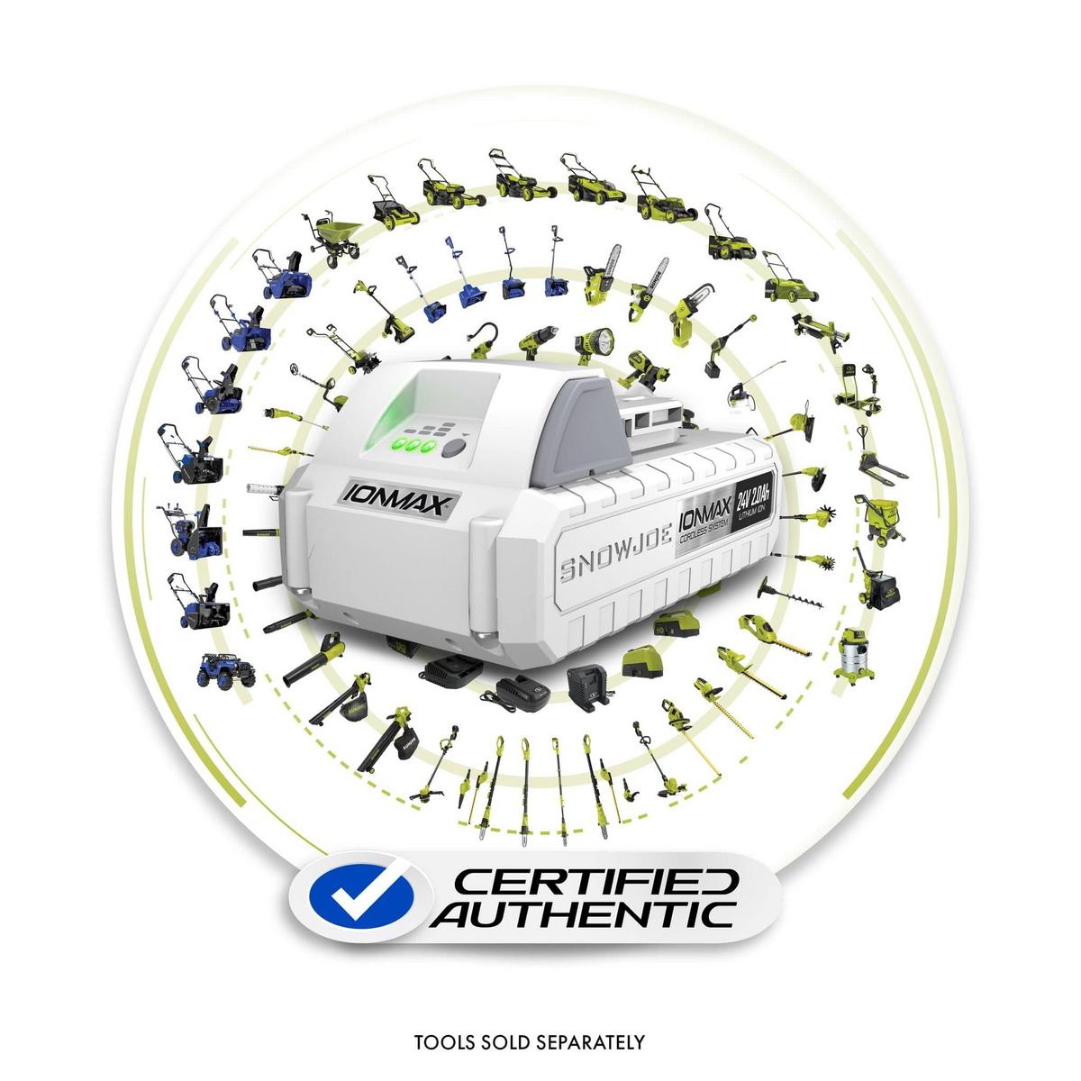 Power up. Power your cordless iONMAX tools with the 24-volt* IONMAX 24VBAT-LTE EcoSharp® lithium-ion battery. Compatible with all Snow Joe® + Sun Joe® 24V* IONMAX models, the 24VBAT-LTE features high capacity 2.0 Ah lithium-ion cells that deliver no-fade power for maximum job performance.Simply insert IONMAX into your 24-volt* tool of choice and power up instantly without having to mess with gas, oil, pull-cords, or tangled extension cords! Breathe easily and confidently while working with your 24VBAT-LTE since rechargeable battery pack provides cleaner, emission-free air during operation. Although run-times will vary depending on the tool used and the job performed, IONMAX charges up for the task in just 80 minutes max.The fuel gauge indicator lights on IONMAX will also let you easily monitor your battery’s charge capacity while it is in use. When it is time to charge, simply slide the 24VBAT-LTE into its dedicated 24VCHRG-AC or 24VCHRG-QC charger. The 24VBAT-LTE holds its charge well in storage and will retain up to 65% charge for six months.Easy, convenient, reliable, and super-lightweight (only 1 lbs!), the 24-volt* IONMAX 24VBAT-LTE is the smart way to battery pack for your power trip.