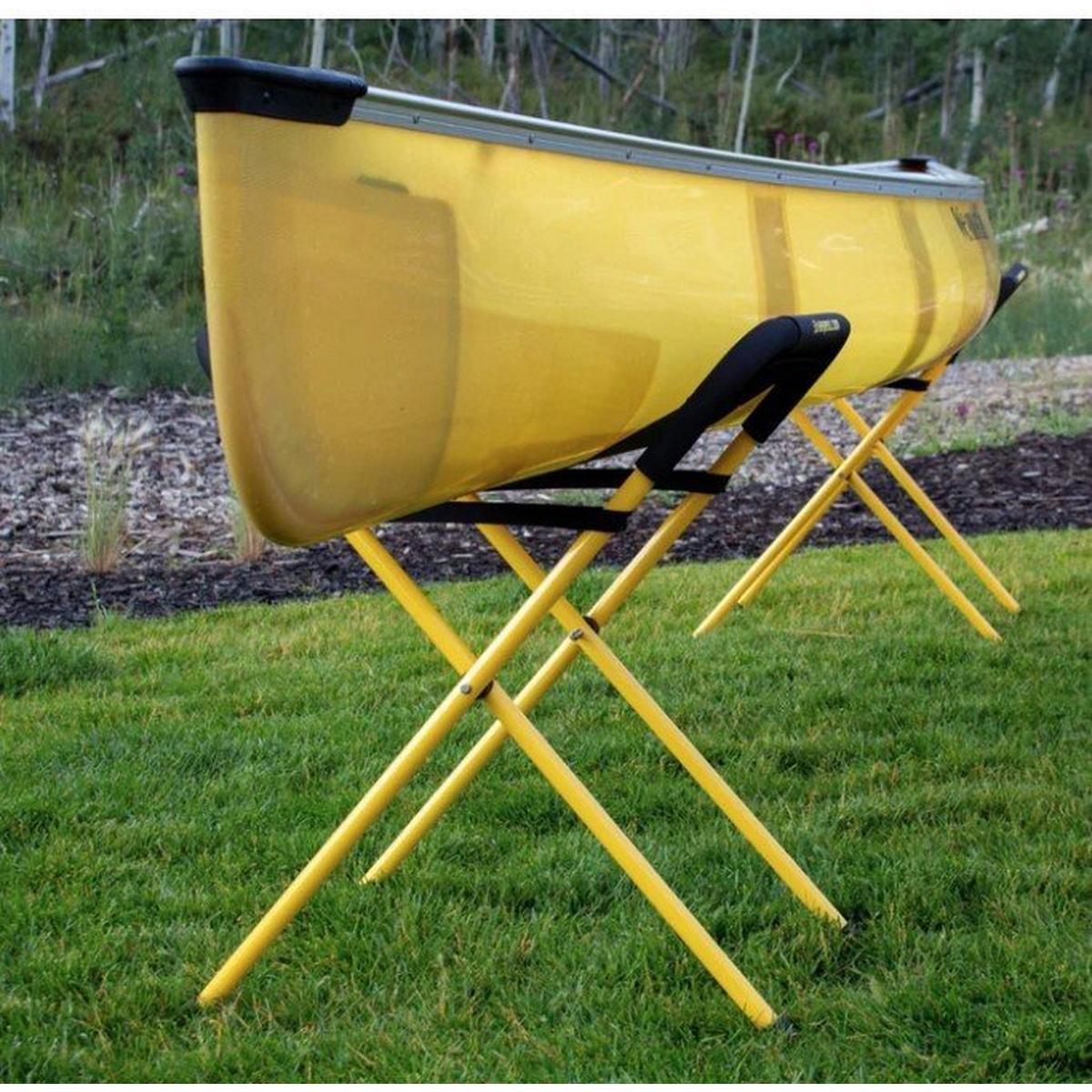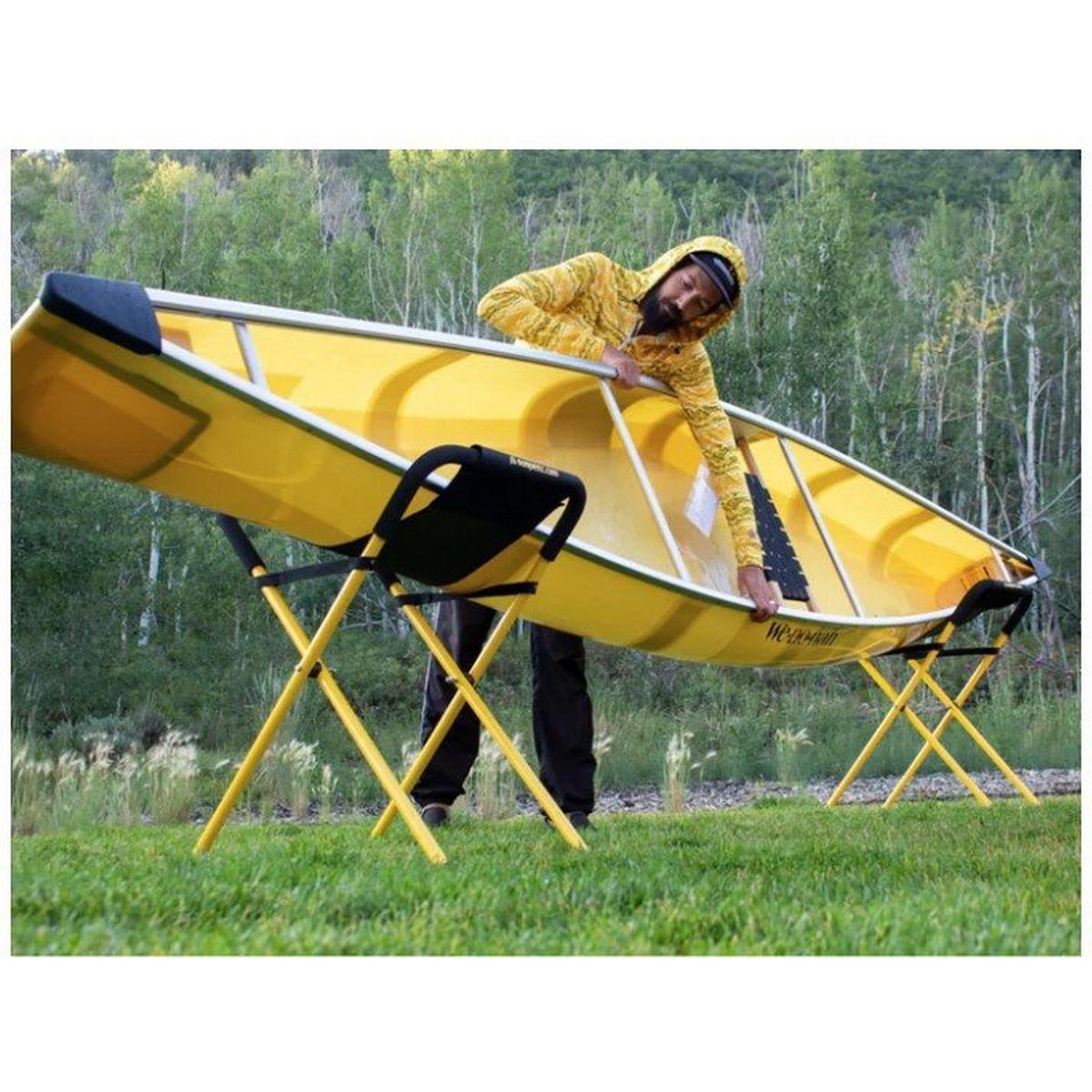 Perfect companion at both the launch site and at home! The Suspenz Heavy Duty Portable Stands have a larger diameter and heavier tubing that withstands more rigorous use than our Universal Portable Stand. They have a stable base at the perfect working height for cleaning & rigging. Constructed of 6061-T6 aluminum with stainless steel hardware to stay free from rust. Features a sturdy canvas sling with a 6” drop that cradles the boat in the right spot, making it easy for one person to manage & rotate! Rubber feet keep the stands steady. No assembly required – just unfold and you’re ready to go! Each stand weighs 6 lbs and has a height of 30”. The wide platform size (19” x 27”) fits multitudes of watercraft sizes. Max load capacity of 175 lbs.