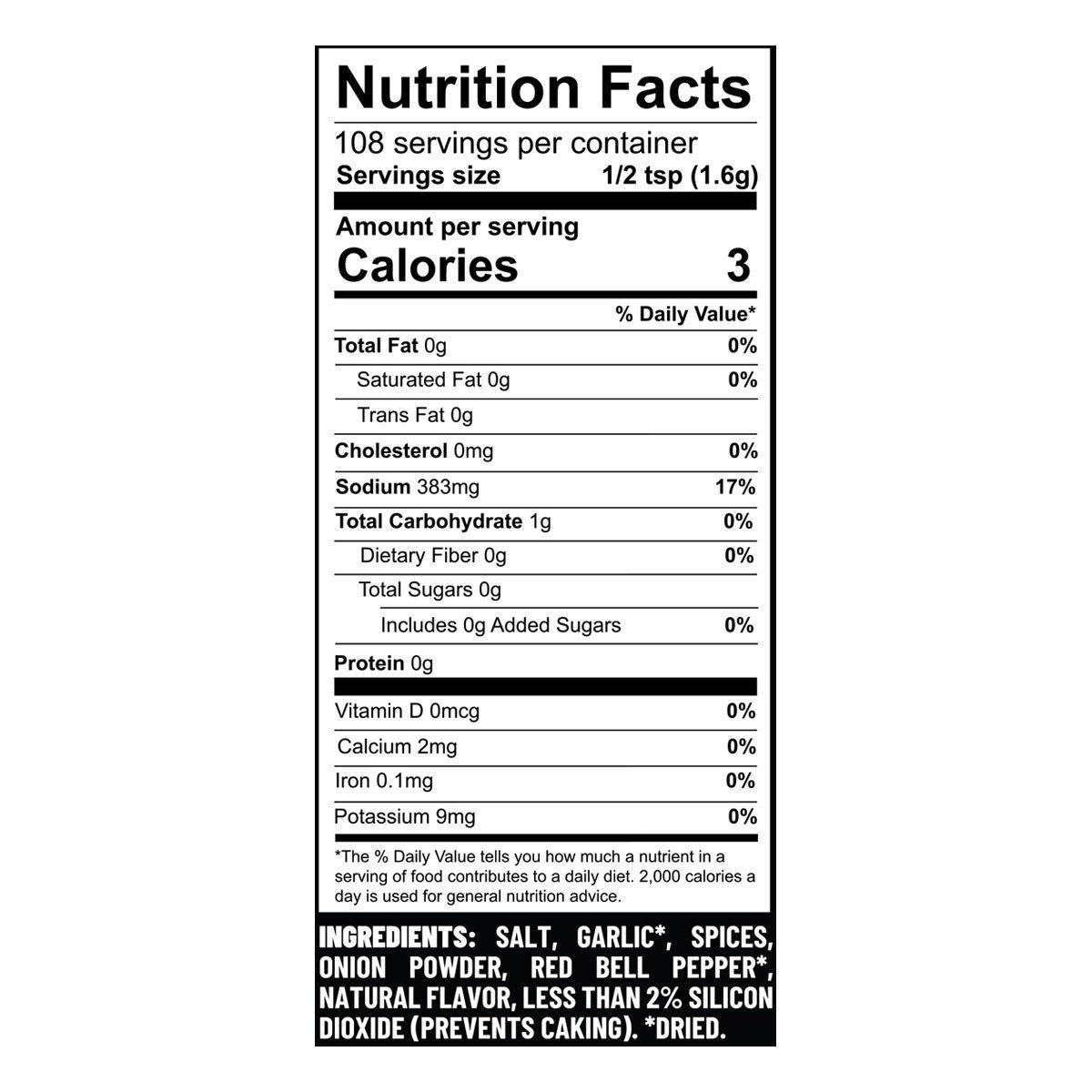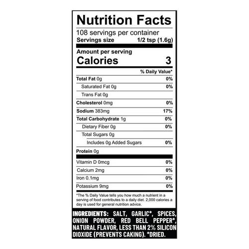 Ingredients: Salt, Garlic*, Spices, Onion Powder, Red Bell Pepper*, Natural Flavor, less than 2% Silicon Dioxide (prevents caking). (*Dried.)