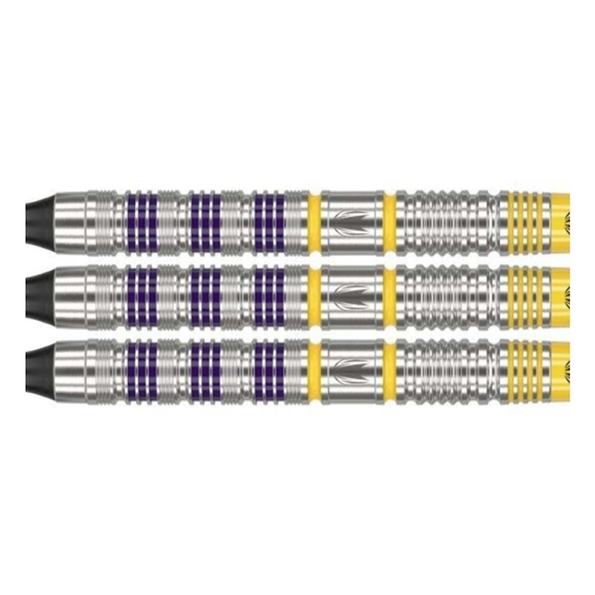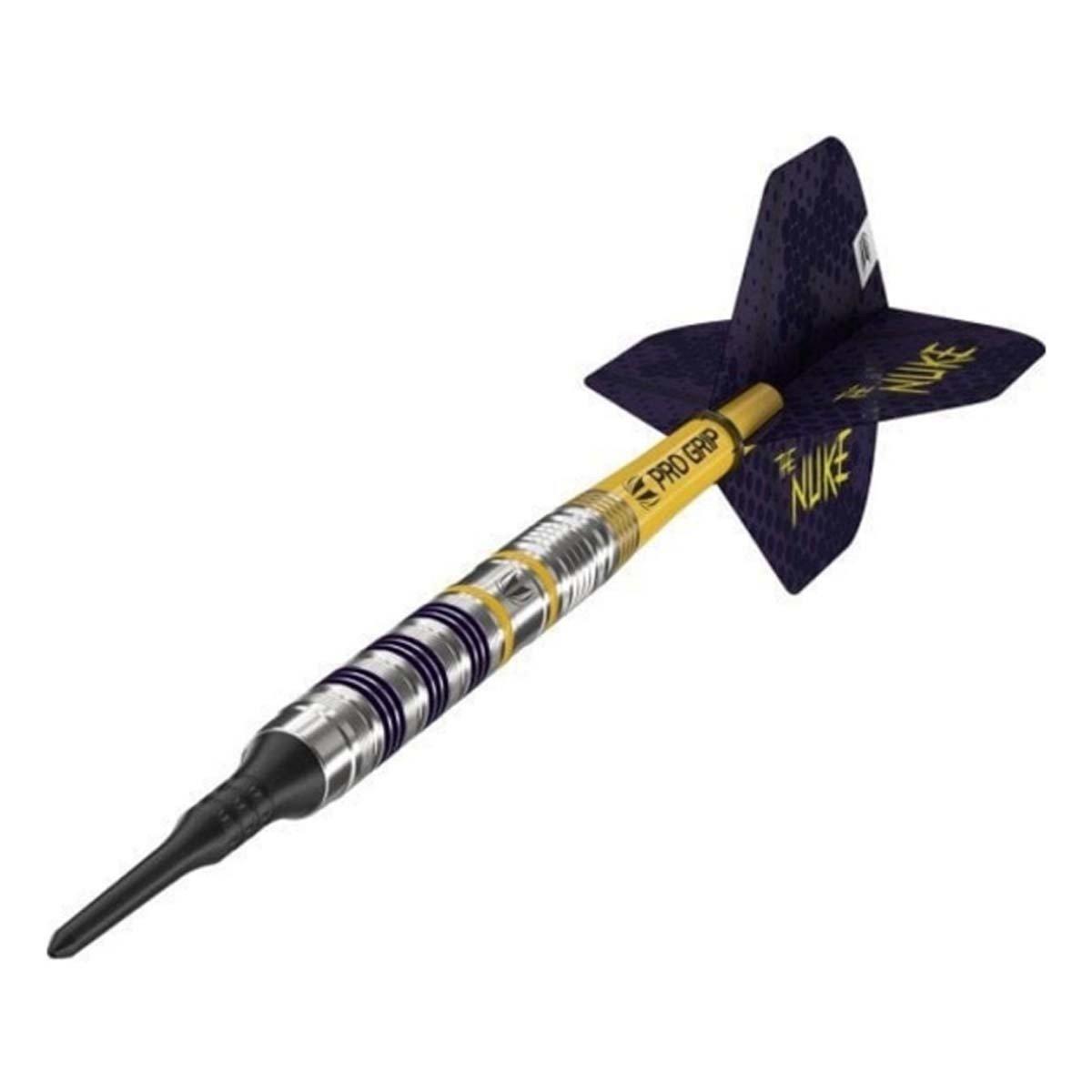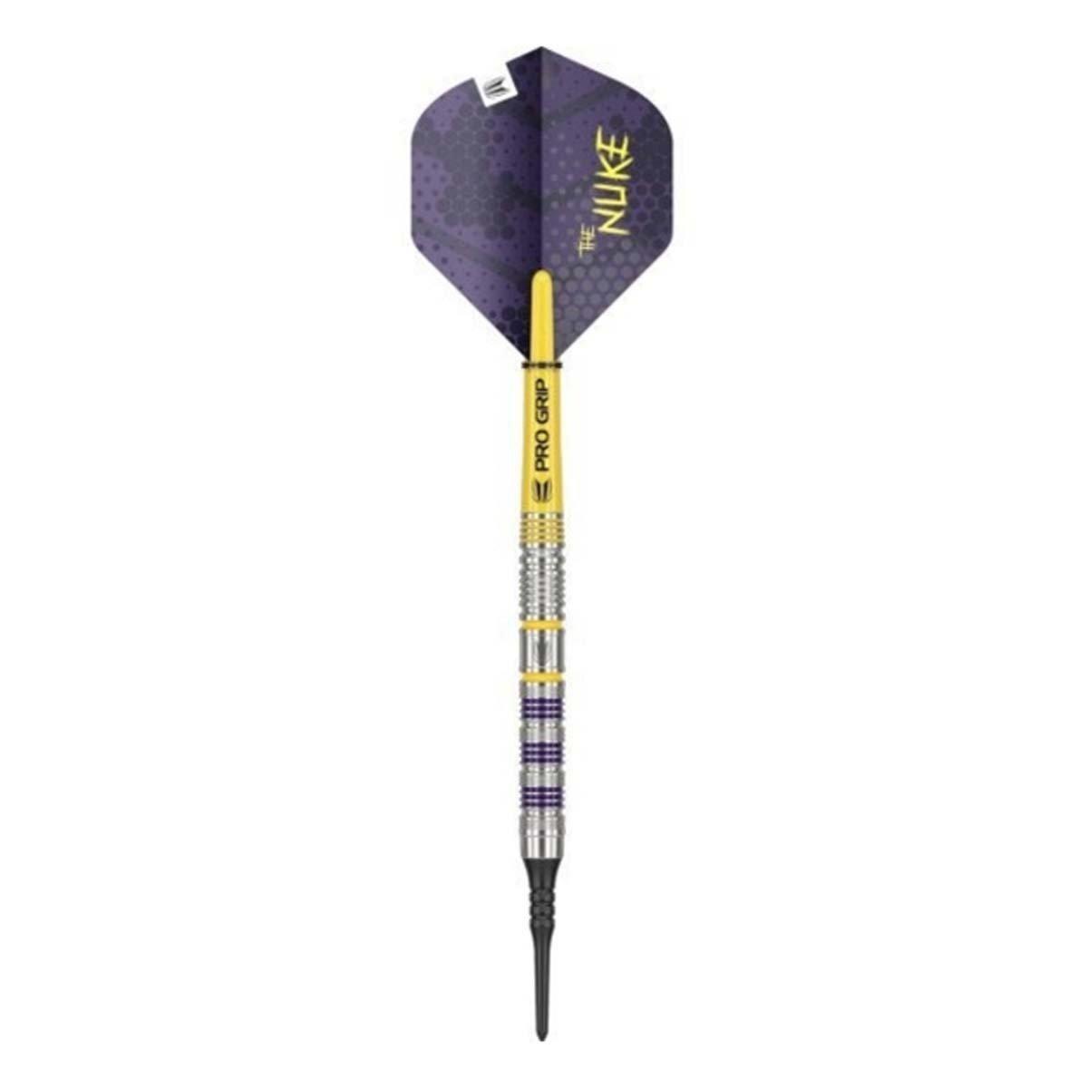Introducing the Luke Littler Loadout Soft Tip Darts, a collaborative design with the 2024 PDC World Championship finalist. The dart set includes a 90% Tungsten straight barrel 47mm in length and a diameter of 6.3mm, featuring radial grooves for enhanced finger grip. Throughout the sleek design, you'll find small pops within the grooves of Nuke’s signature purple and yellow colours.