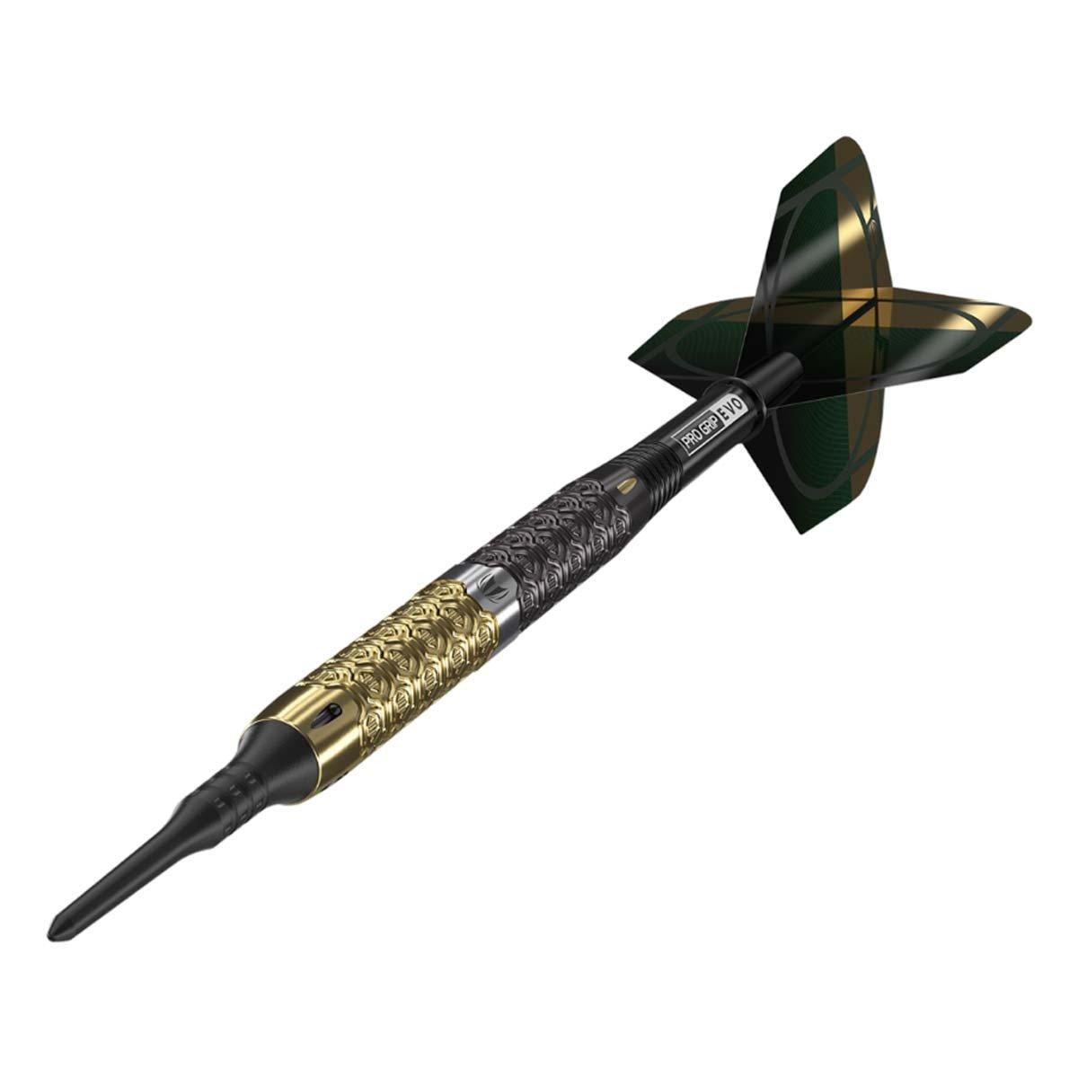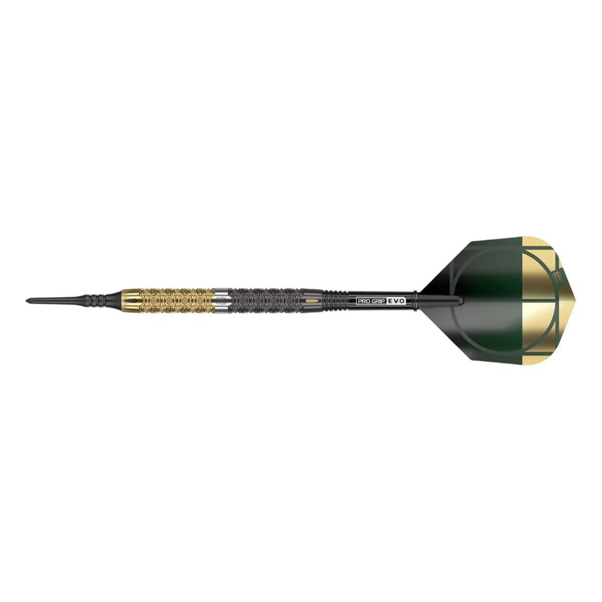The Elysian-inspired grip features a distinctive black and gold performance coating containing a number of cells throughout for a strong yet subtle grip texture. The stunning engineered barrels flow into the high performance Pro Grip EVO shafts finished with flights that feature accents of deep green for a truly special look for a complete dart inspired by a luxury lifestyle aesthetic. The straight barrels are completed with black Pixel Tips suitable for all soft tip dartboards or use a conversion point (sold separately) to play on a steel tip dartboard.
