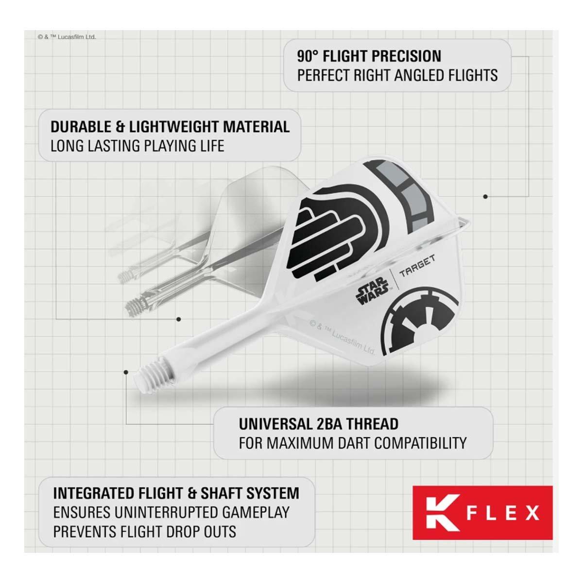 March onto the oche with the STAR WARS™ | TARGET Stormtrooper K-Flex Integrated Flights and Shafts, created in collaboration with The Walt Disney Company. Designed in crisp white with bold black detailing, these official K-Flex shafts capture the unmistakable look of Imperial armour and the discipline of the Empire’s most recognisable soldiers.