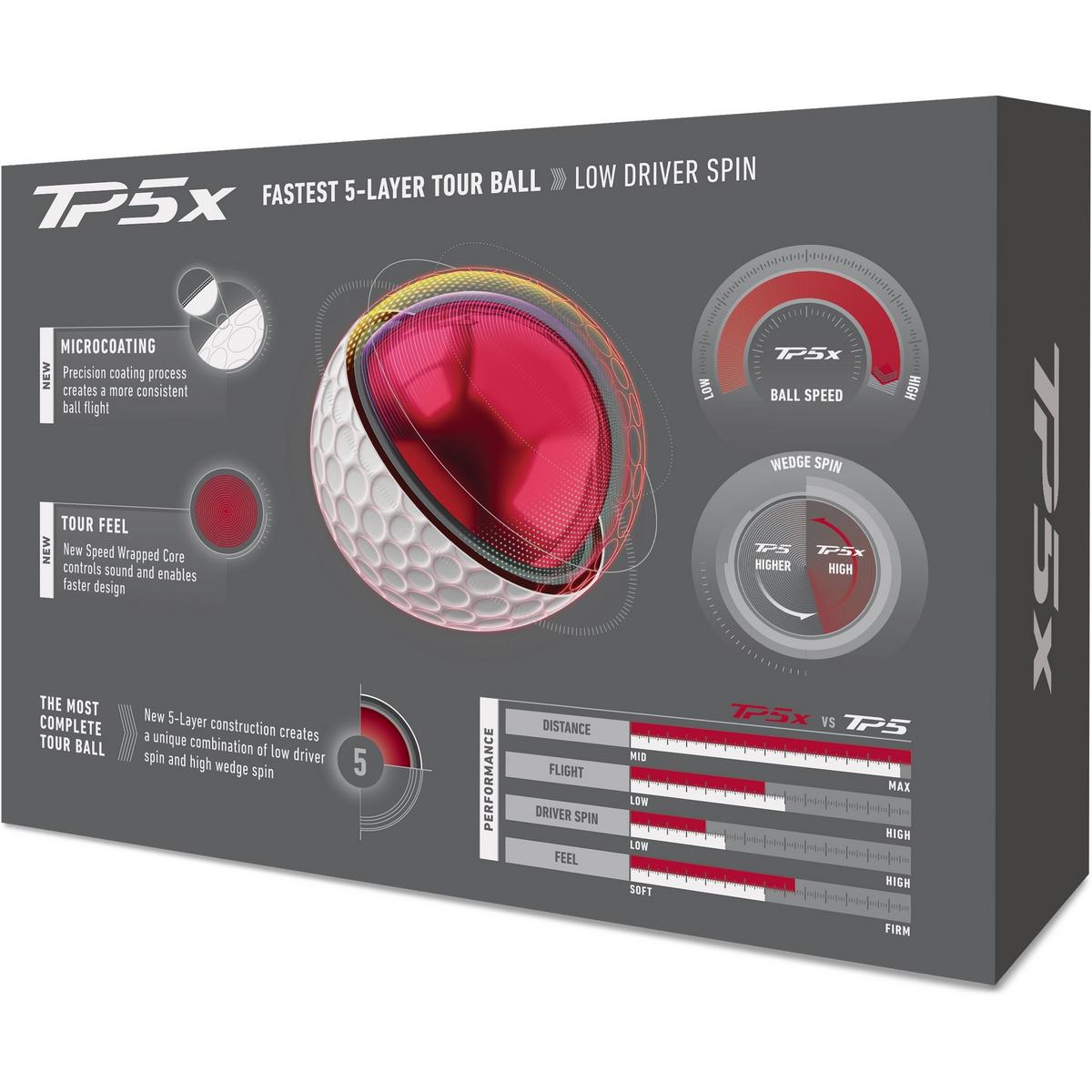 The TP5x employs our revolutionary microcoating process that ensures an even paint application across the entire surface of the ball, providing consistent ball flight and tight shot dispersion throughout your bag.