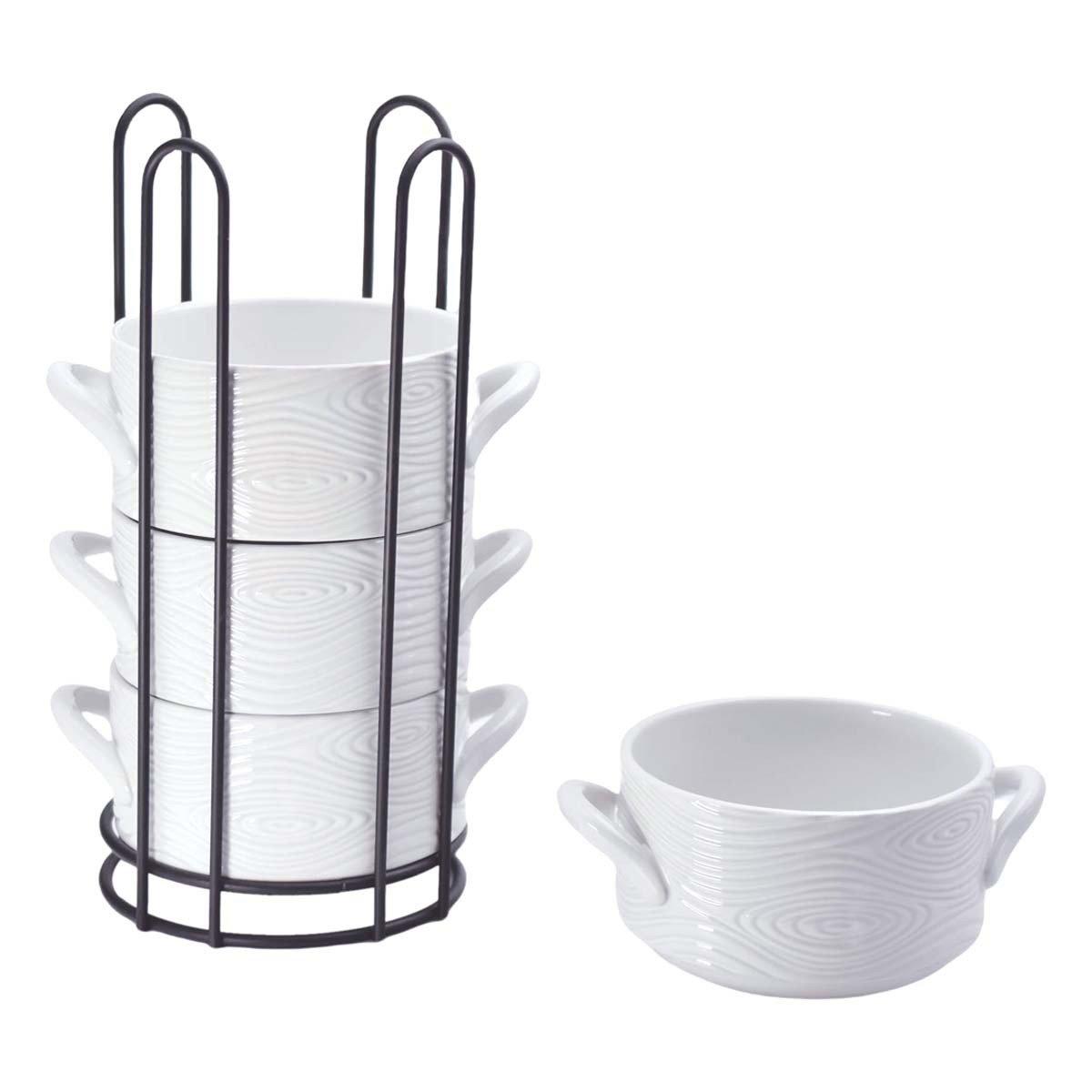 When you stack these 22oz bowls together and tuck them securely inside their sturdy, metal storage rack, you'll save room on your countertop or in your cabinet. They're a stylish way to enjoy your favorite soup, tea, coffee, or ice cream.