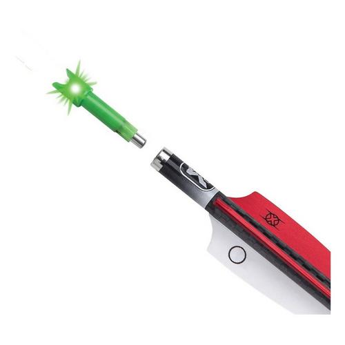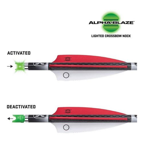 The Alpha-Blaze Lighted Nock contains a one-piece Nock/LED unit that is indexed with the vanes and press fits into the arrow’s Aluminum Bushing. Upon firing the crossbow, the bowstring’s force compresses the two pieces and activates the lighted nock. Deactivate the easy on/off Alpha-Blaze lighted nock by pulling the nock straight out until the light turns off. The LED light of the Alpha-Blaze system lasts for approximately twenty-four hours when activated.