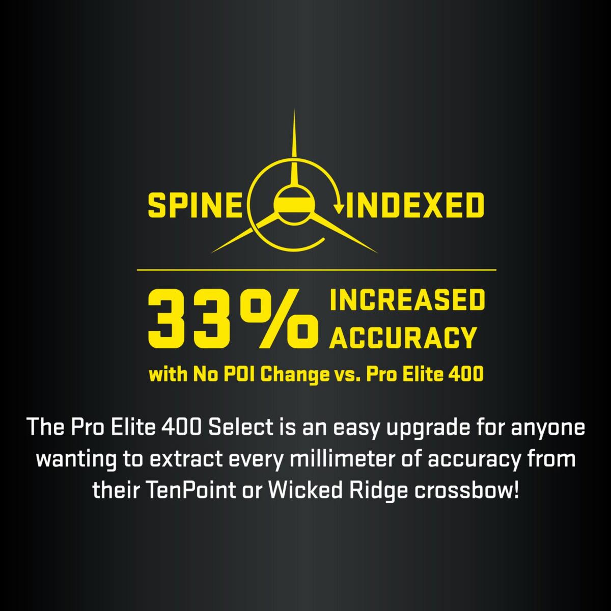 Weighing 410–grains, the precision spine-indexed Pro Elite 400 Select increases accuracy by 33%, delivering tighter groups while maintaining the same point-of-impact as the standard Pro Elite 400 Carbon Arrows.