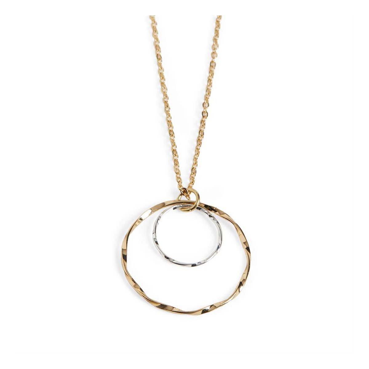Crafted with meticulous attention to detail, this beautiful necklace features two interlocked hoops with a unique wavy design. The undulating curves of the hoops create a dynamic visual effect that is both modern and timeless, making a striking impact on any outfit.