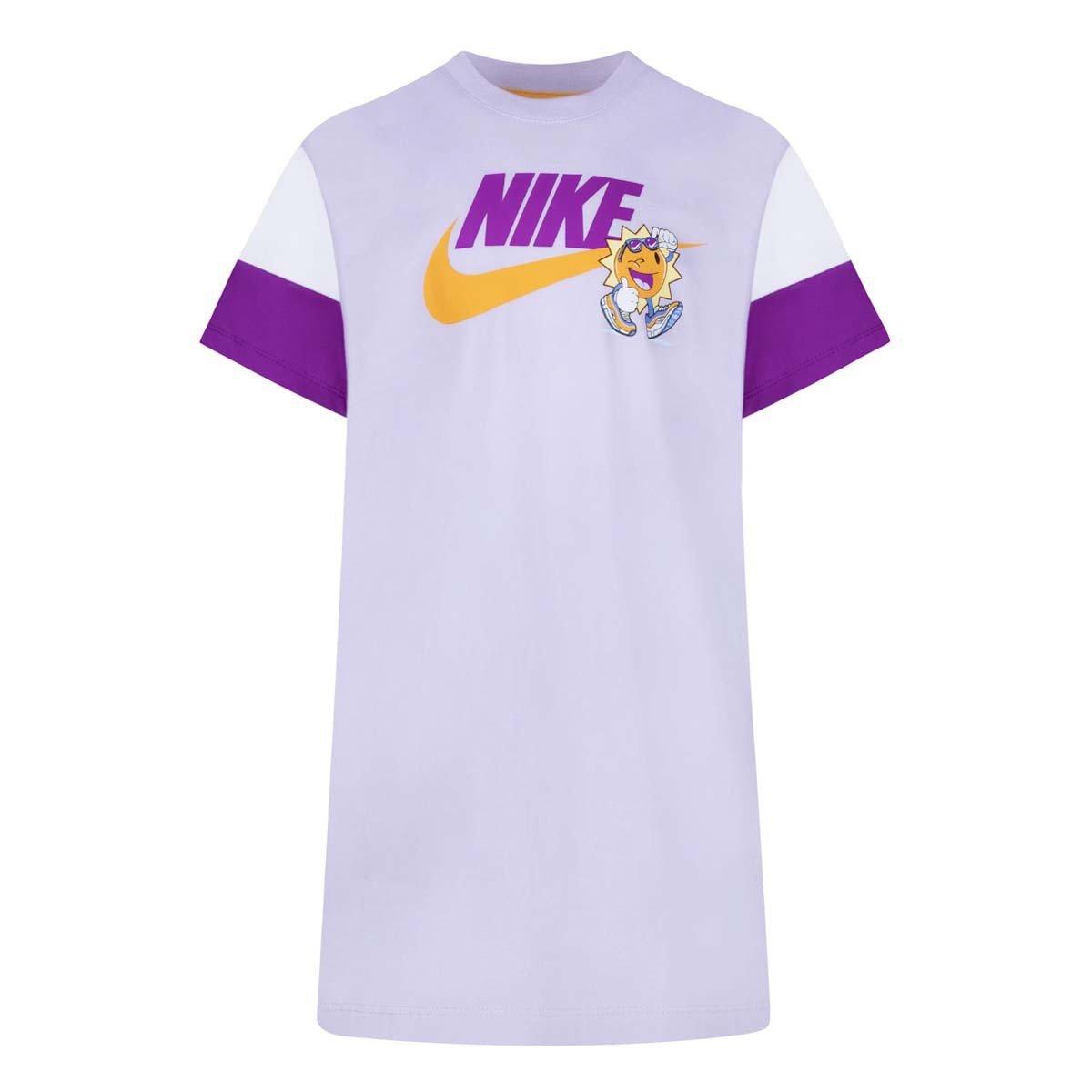 Made of cotton/poly jersey knit fabric, this play dress from Nike has the feel of your little one's favorite cozy tee. It features colorblocked short sleeves and a fun illustrative graphic Nike Futura logo print. The tagless crewneck provides a comfy feel, dropped shoulders provide a relaxed fit and the roomy cut makes it easy to layer over bike shorts or leggings for full coverage for freedom of movement.
