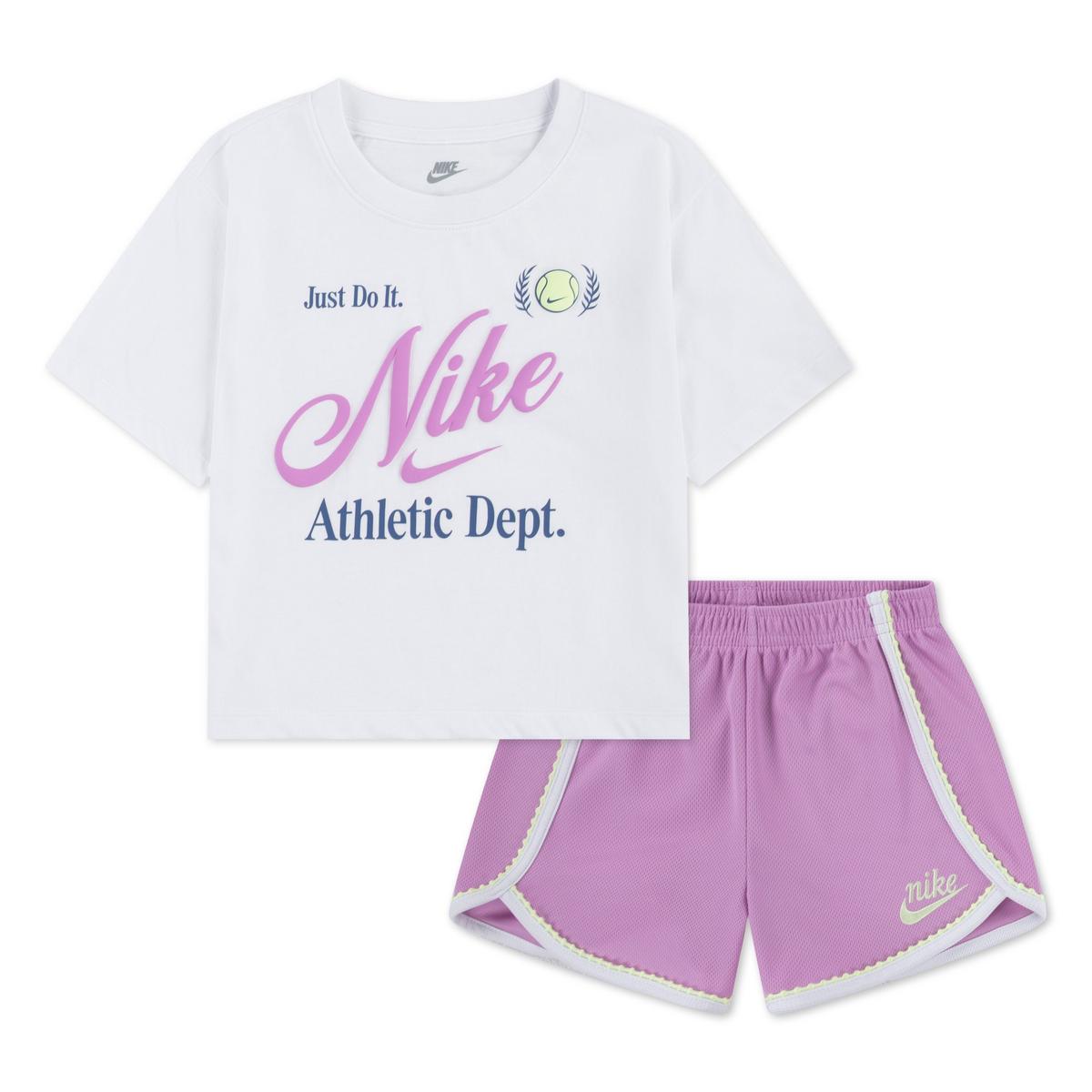 Whether it's on the court or at the playground, kiddos can push the tempo in this tennis-inspired 2-piece performance set from Nike. The cotton/poly graphic tee has a boxy cut, a tagless crewneck for fuss-free wear, and dropped shoulders that relax the fit. The poly mesh knit shorts are breathable, with a soft, smooth feel, feature contrast binding trim, and a comfy stretch waistband. Game, Set, MATCH!