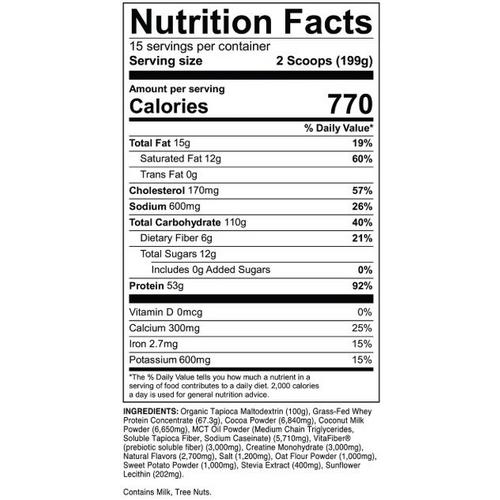 Each serving provides 760-770 calories, 53-55g of grass-fed whey protein, and over 100g of complex carbs from oat flour, tapioca, and sweet potato.
