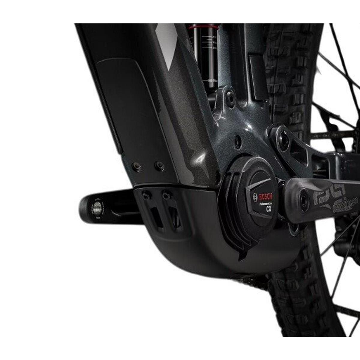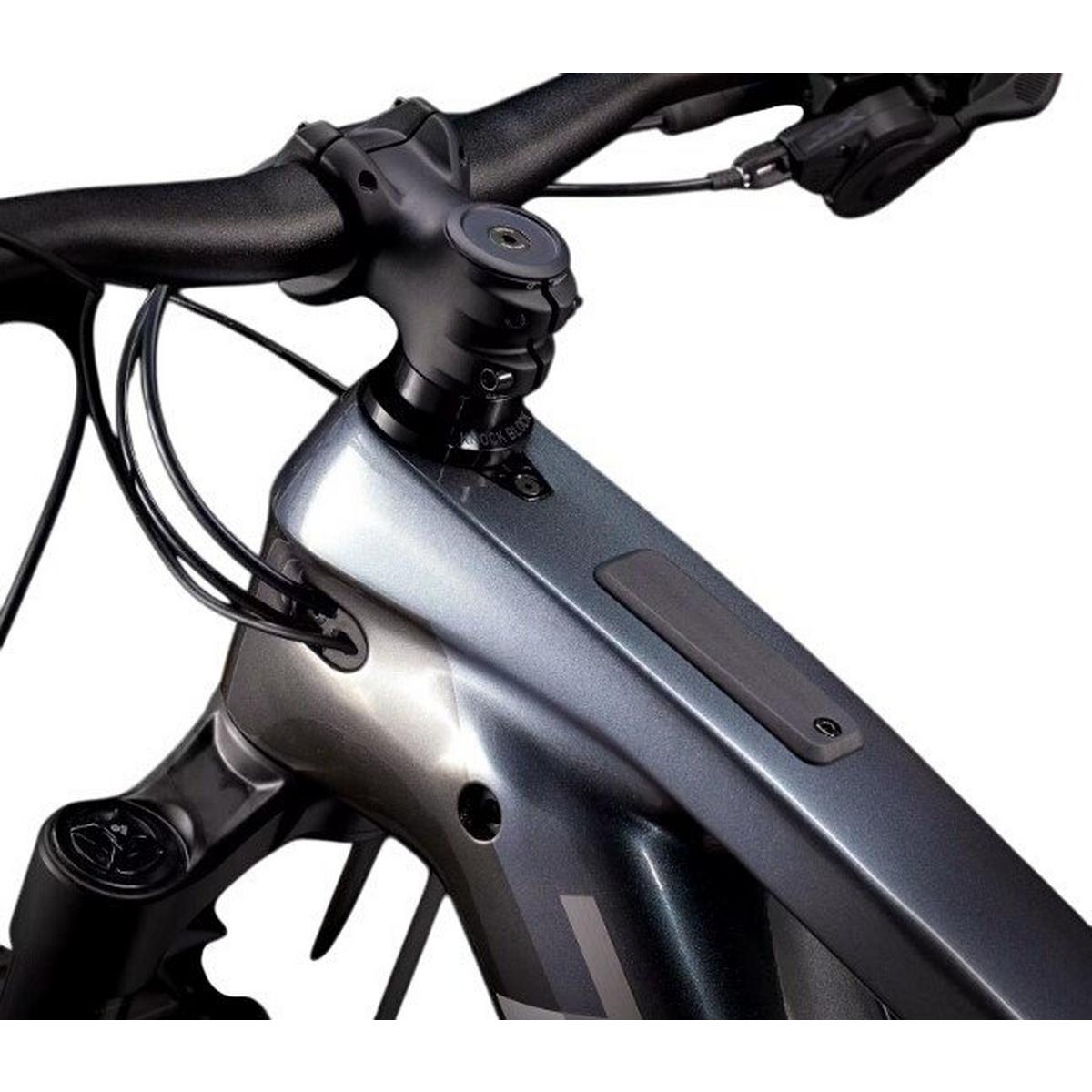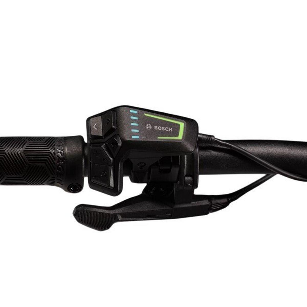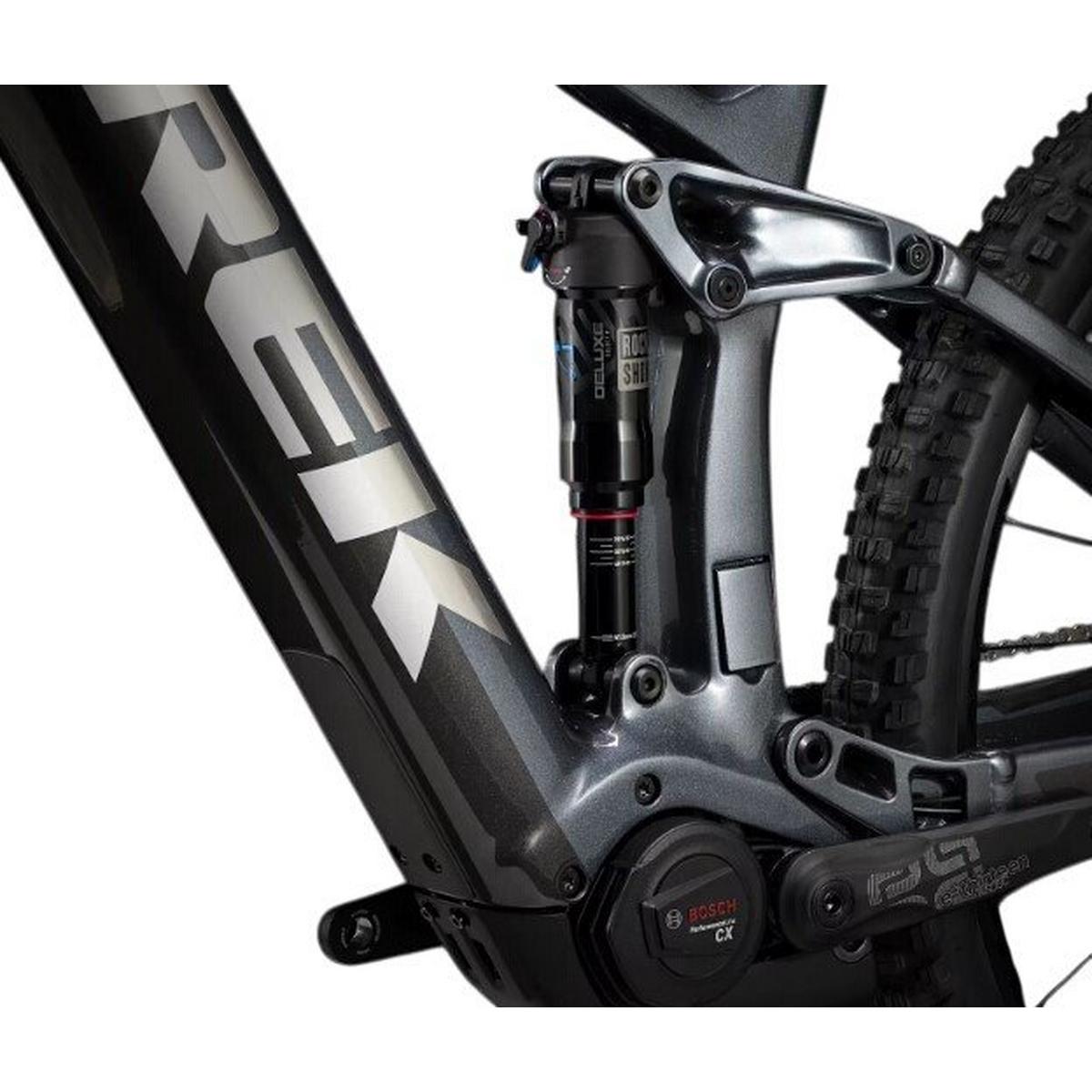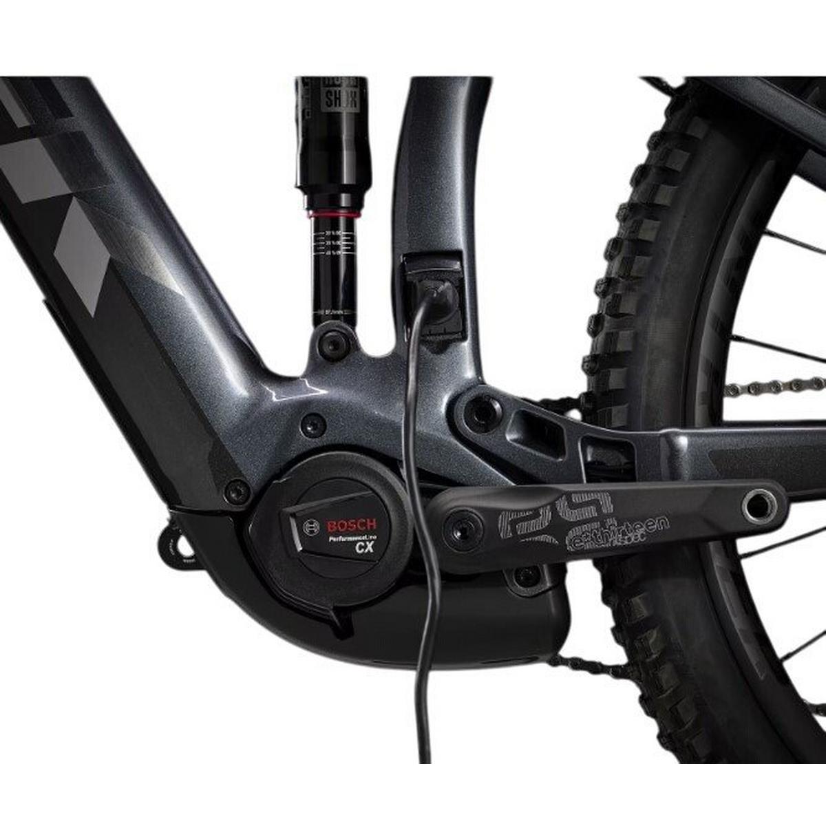 An OCLV Mountain Carbon frame with a 750Wh Removable Integrated Battery, a 160mm RockShox Domain fork, 150mm RockShox Deluxe Select+ rear shock, and Bosch's latest smart system Performance Line CX capable of speeds up to 25KM/H, with a Bluetooth® LED remote for connectivity and activity tracking through the eBike Flow app. A 1x12 Shimano SLX/XT drivetrain, Bontrager Line dropper post, 4-piston brakes for confident descents, and tuneless ready Bontrager Line Comp 30 29er wheels.