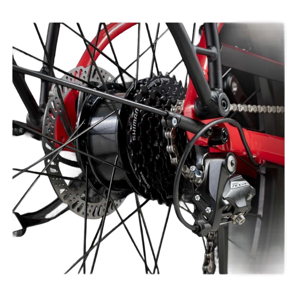 A lightweight Alpha Gold Aluminum frame with lowstep geometry, an 8-speed Shimano drivetrain, a Hyena (250W, 40Nm) motor capable of sustaining speeds up to 20mph, an LED Bluetooth controller, and 250Wh battery. Plus, hydraulic disc brakes, an adjustable integrated cockpit, extra wide 27.5 x 2" tires for stability and traction, ergonomic grips, fenders, lights, and a MIK-compatible rear rack.