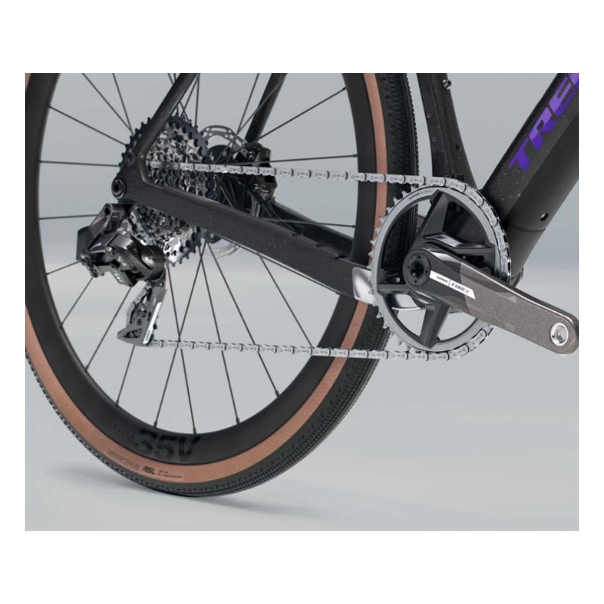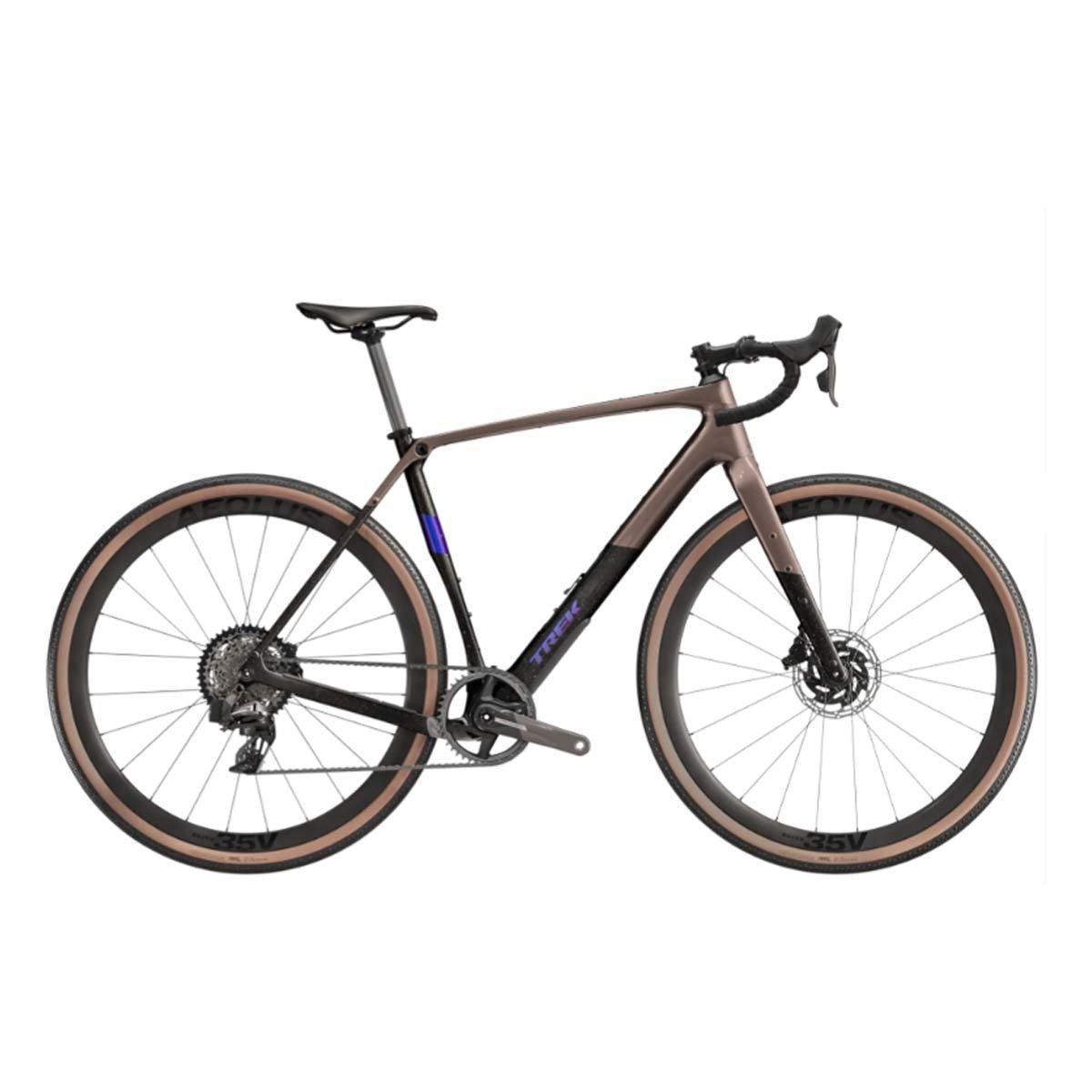 A 500 Series OCLV Carbon frame with a carbon fork, internal downtube storage, clearance for 50 mm tires (as measured), and frame and fork mounts. A 12-speed 1x SRAM Force XPLR AXS fully wireless drivetrain, hydraulic disc brakes, carbon seatpost, and Tubeless Ready Bontrager Aeolus Elite 35V wheels with 42mm tires.