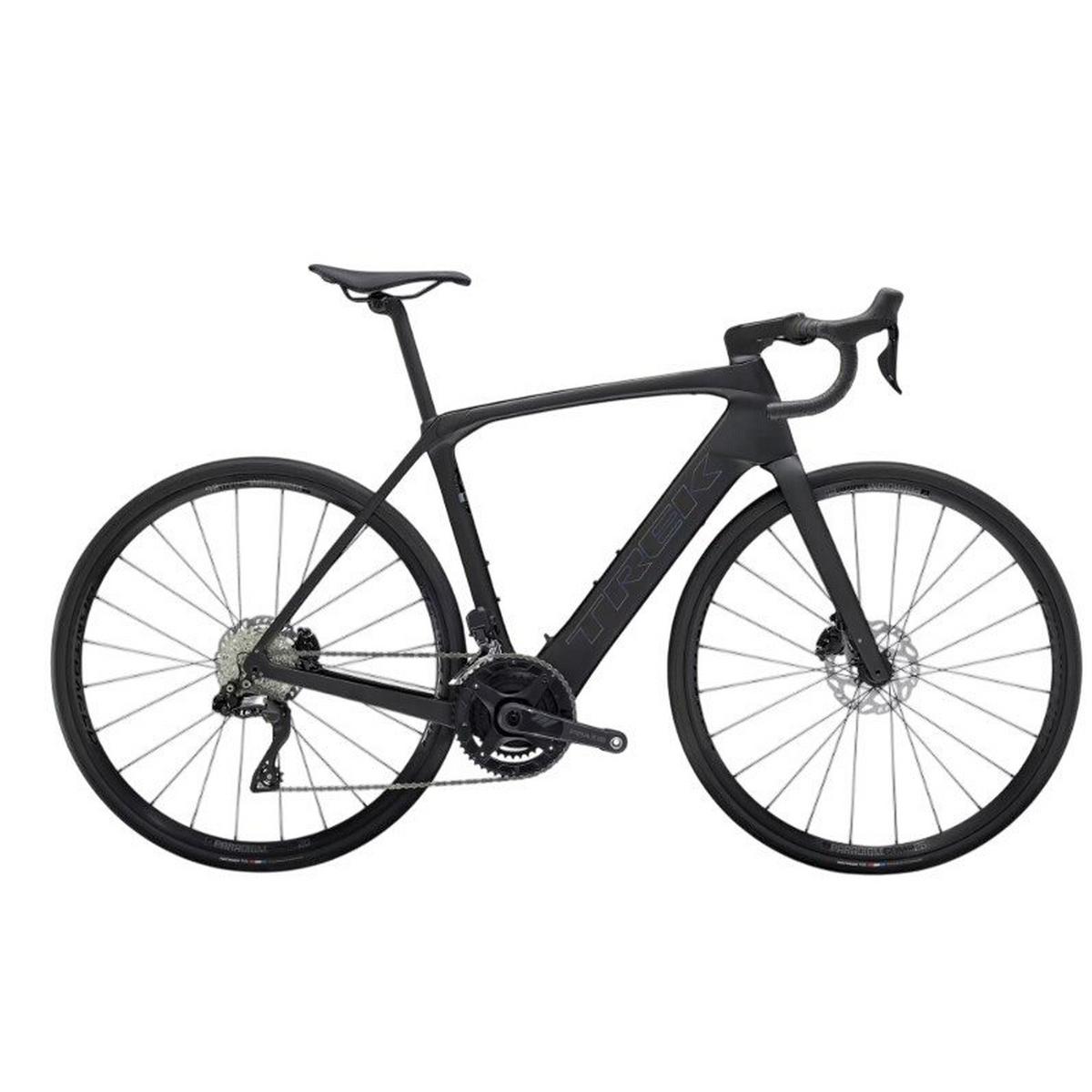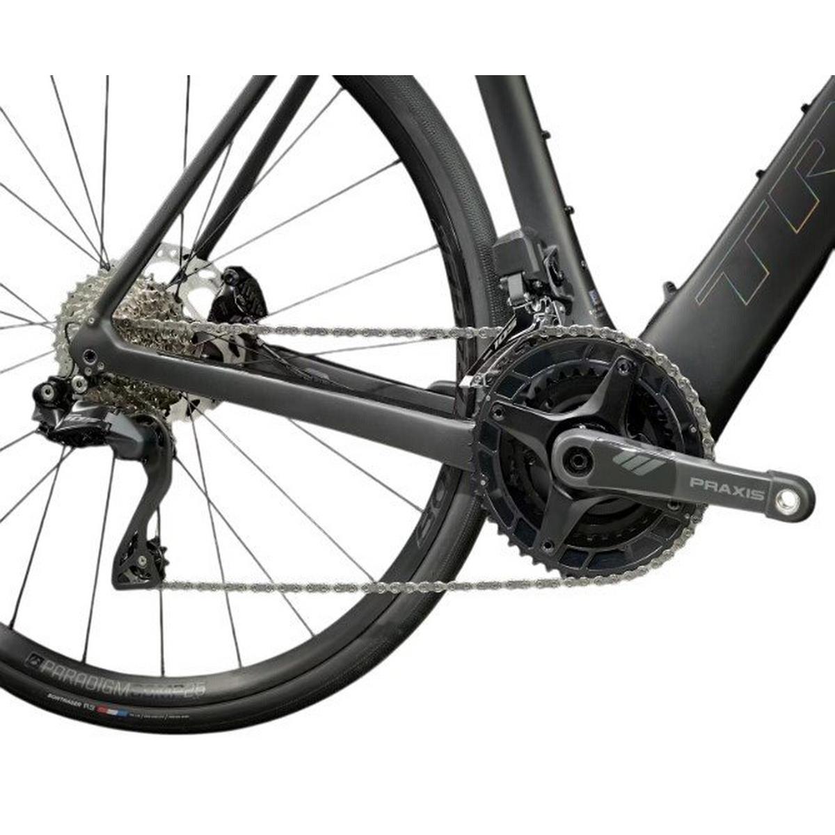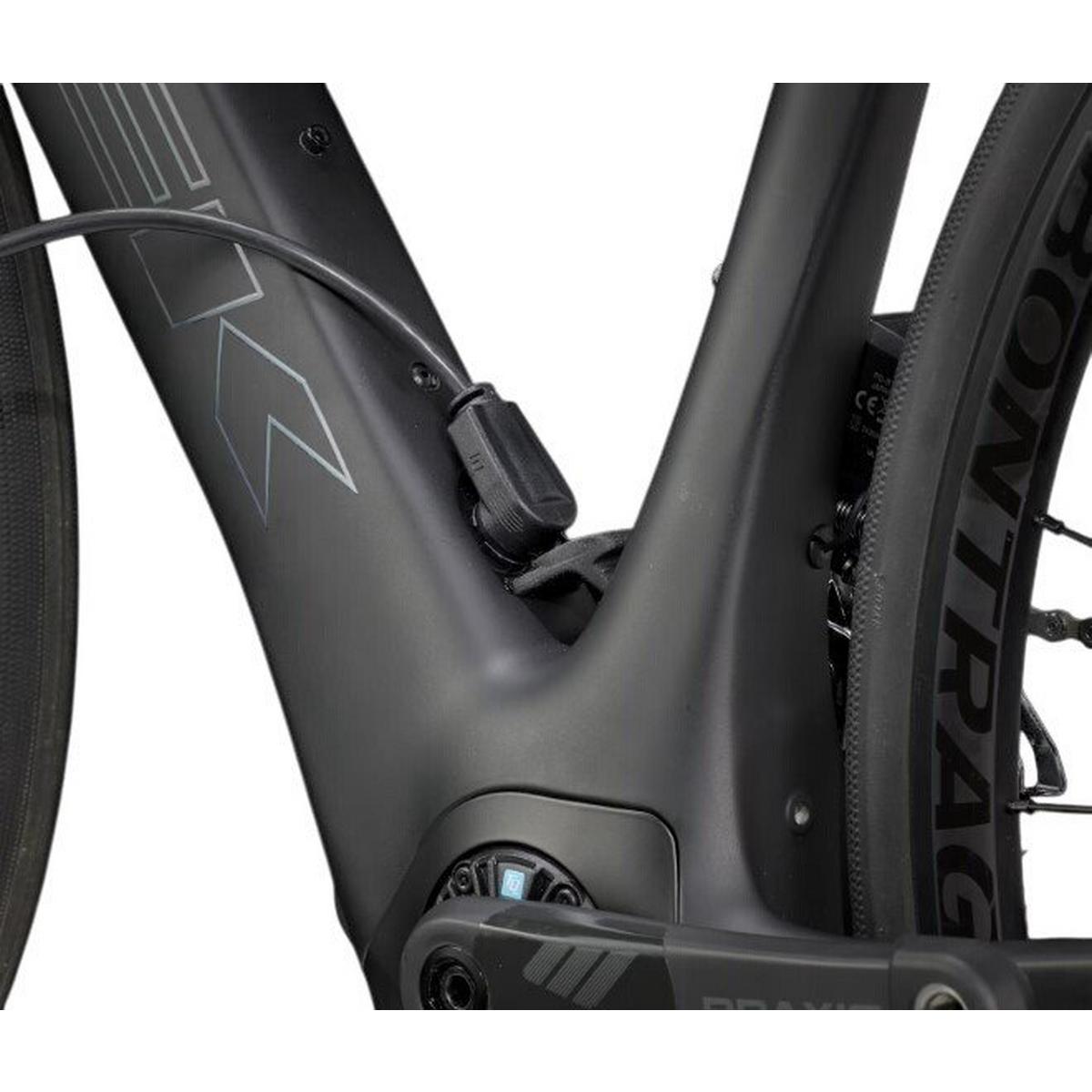 A supremely light 800 Series OCLV Carbon frame with rear IsoSpeed. A powerful 50Nm TQ harmonic pin ring motor that assists up to 28mph, a 360Wh integrated battery, an integrated smart LED display, and discreet hood-mounted controls for toggling through assist modes. Shimano 105 2x12 Di2 wireless electronic drivetrain, carbon cranks, a vibration-absorbing Bontrager Pro Iso-Core handlebar, and a RCS Pro stem that fully integrates your cables for a sleek look.