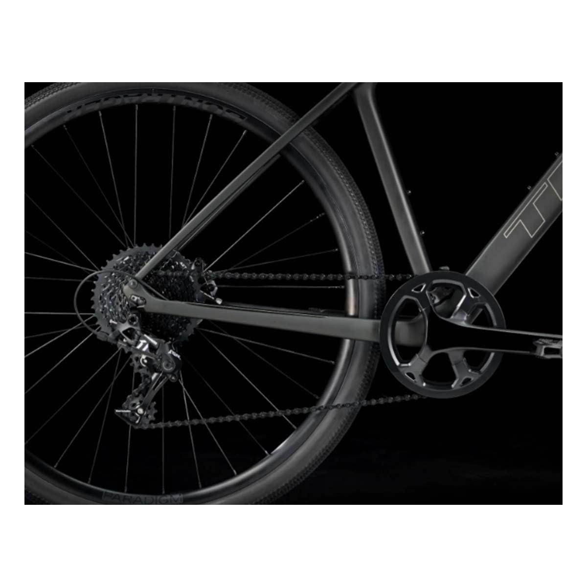 A lightweight 400 Series OCLV Carbon frame and fork, a 1x SRAM Apex drivetrain with a wide range of gearing, hydraulic disc brakes, hidden fender mounts, a lightweight tubeless-ready Bontrager Paradigm alloy wheelset, wide, fast-rolling Bontrager GR1 Expert gravel tires, and a vibration-absorbing handlebar with ergonomic grips.