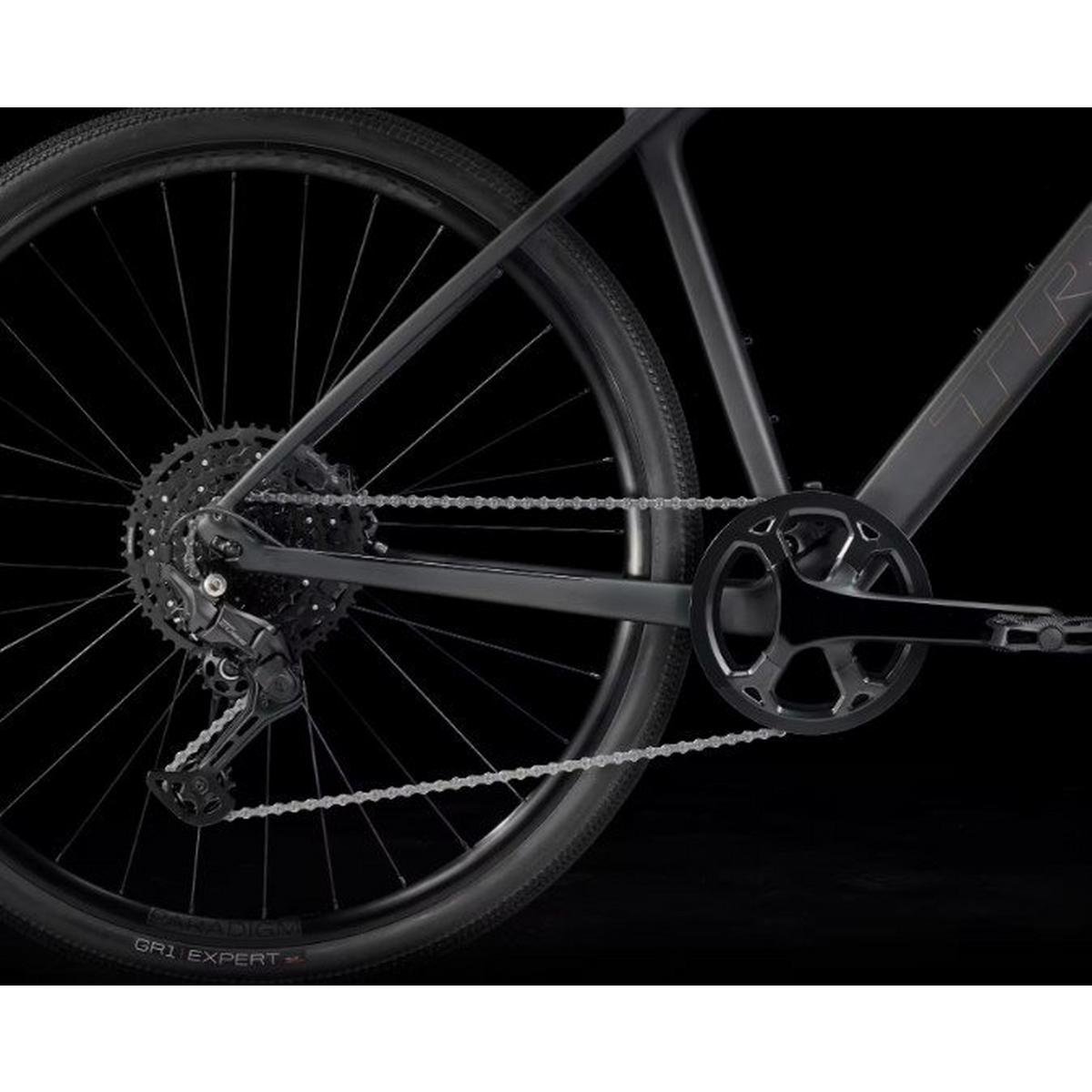 A lightweight 400 Series OCLV Carbon frame and fork, a Shimano CUES 10-speed drivetrain with a wide-range cassette, Shimano hydraulic disc brakes for all-weather stopping power, a lightweight tubeless ready wheelset, wide, fast-rolling Bontrager GR1 Expert gravel tires, and a vibration-absorbing handlebar and ergonomic grips.