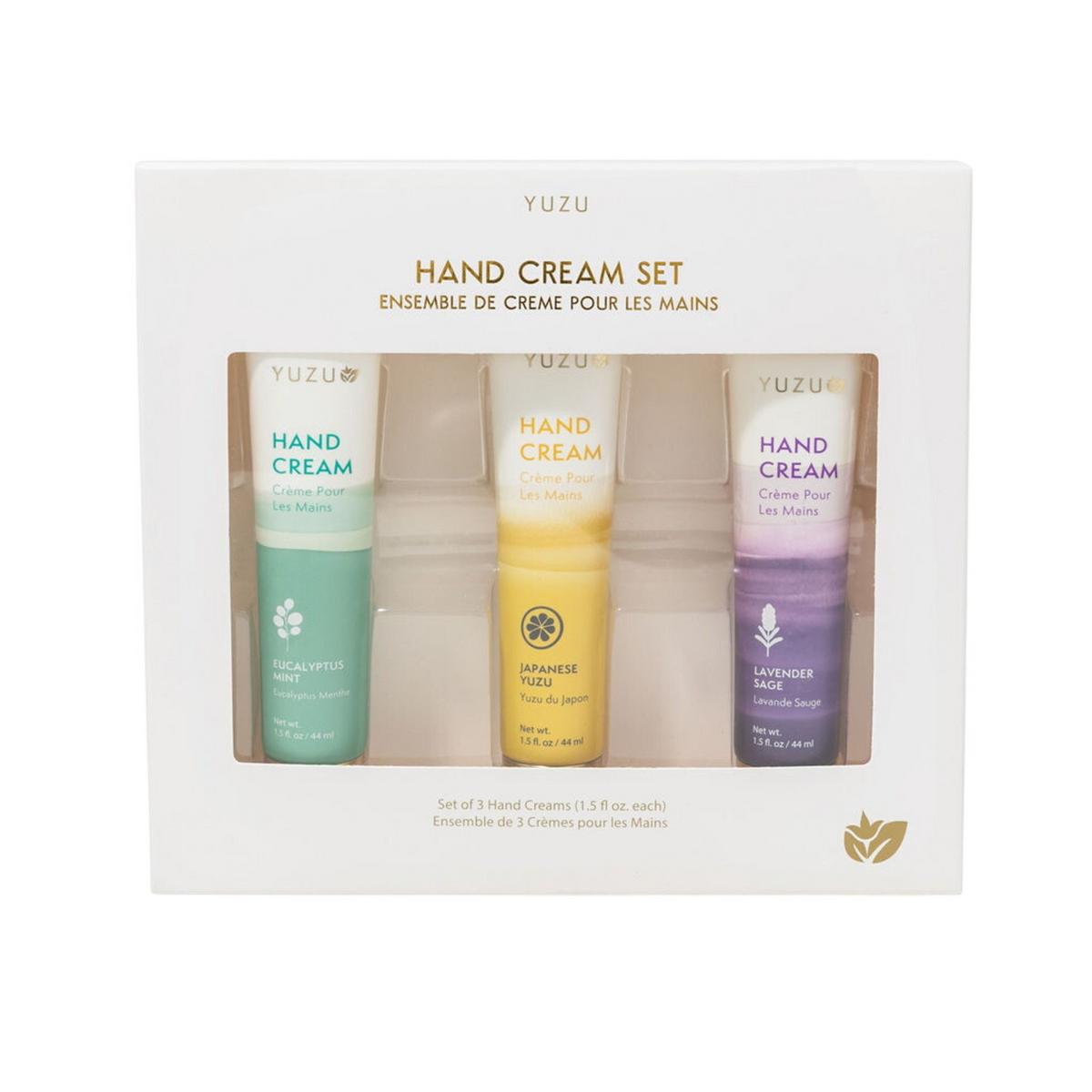 Set includes three 1.5 oz hand creams in Lavender Sage, Eucalyptus Mint and Japanese Yuzu. Hand creams are packaged in recyclable plastic tubes.