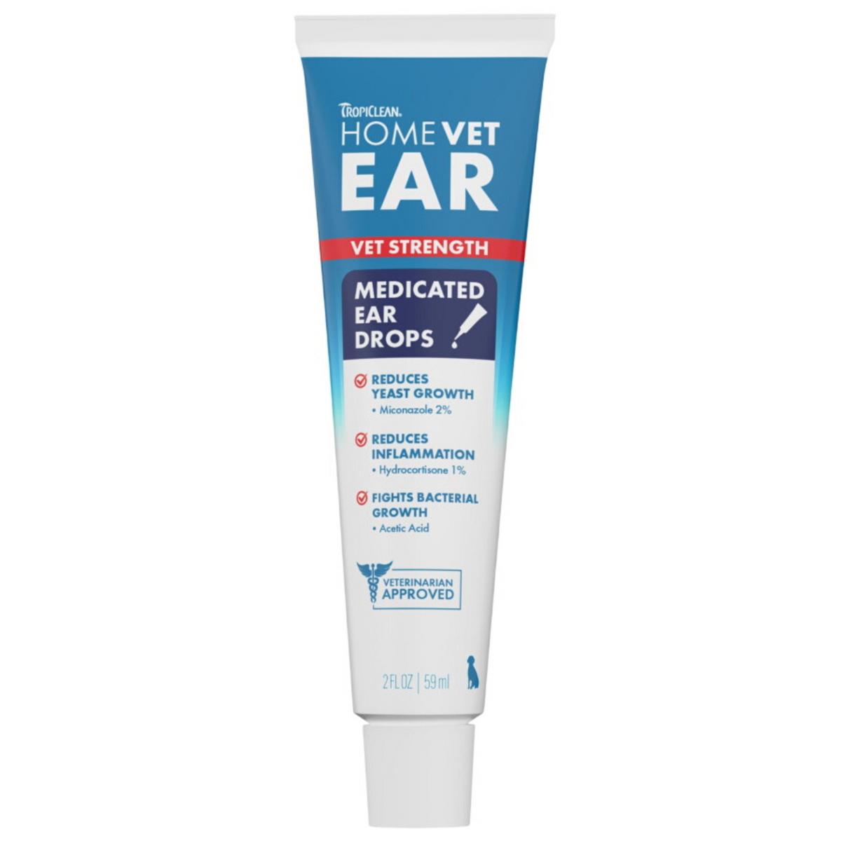 TropiClean HomeVet Medicated Ear Drops combines miconazole to combat fungal infections, hydrocortisone to soothe irritation, and acetic acid to reduce odor— restoring comfort to your dog’s ears