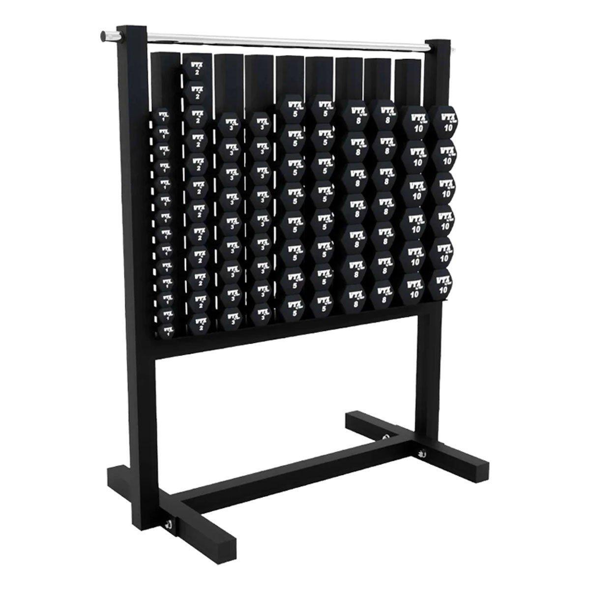 Our Aerobic Pac Rack prominently displays and stores 43 pair of vinyl or neoprene dumbbells. It comes complete with a Security “Locking bar” (shown in image) which allows limited handling while deterring unwanted removal of the dumbbells. Dumbbells, Padlock, Casters or Accessory Rack not included.