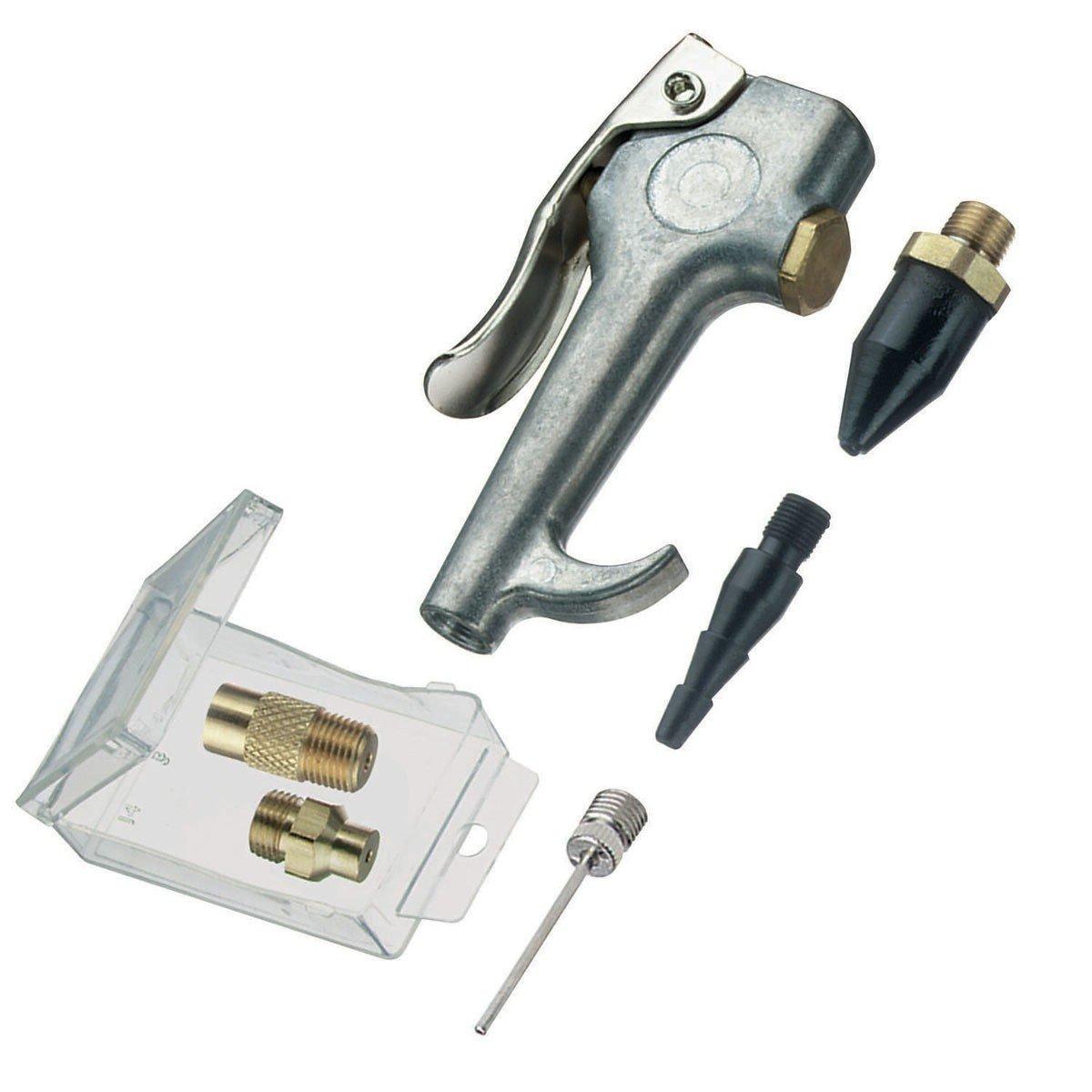 Air blow gun with four interchangeable nozzles for cleaning and inflating. Perfect for blowing sawdust and grass clippings, drying surfaces or inflating balls, rafts and air mattresses.