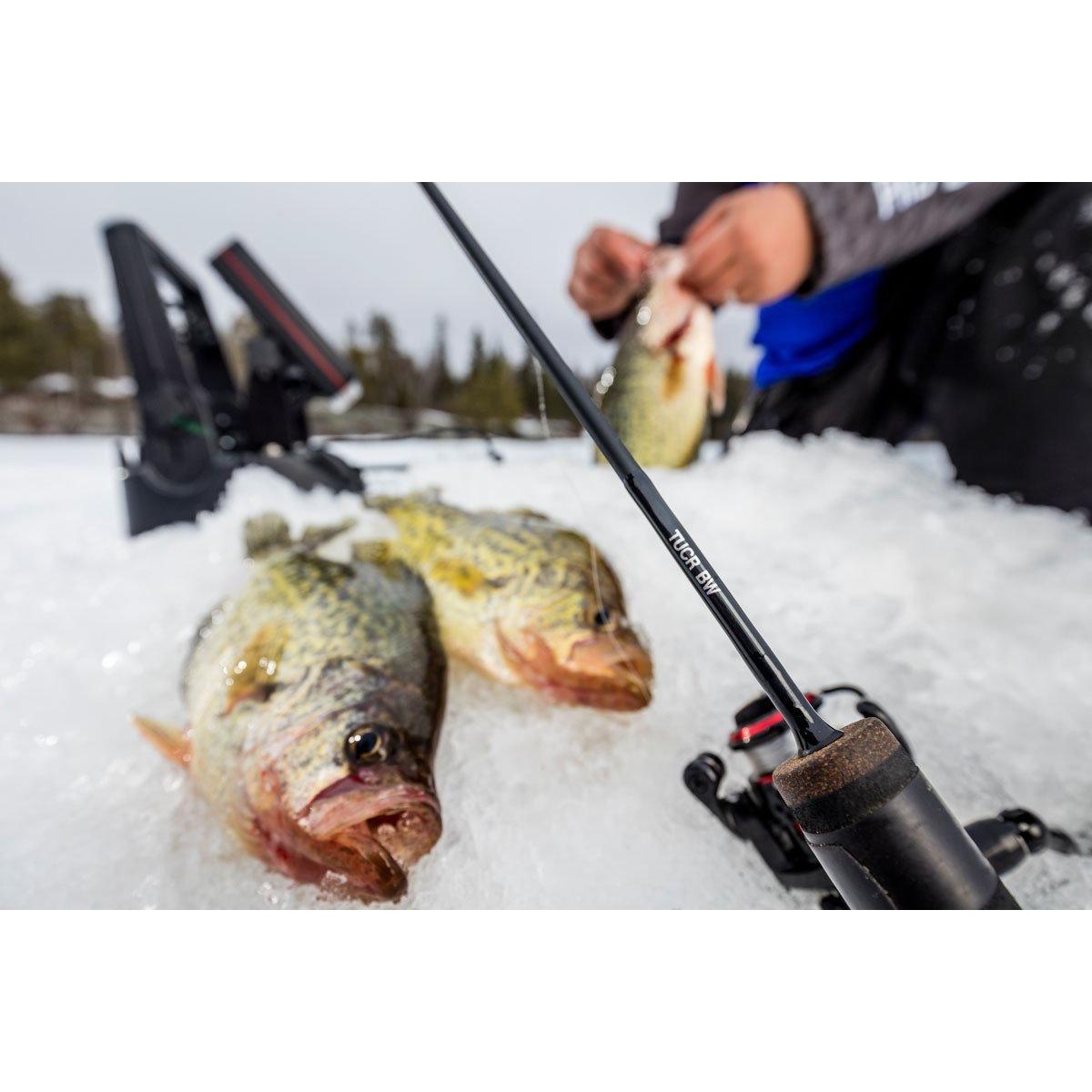 The Tuned Up Custom Bullwhip Ice Rod is designed to make full use of tungsten jigs and delivers reliable performance perfect for crappie and other panfish. The fast-action noodle tip on the Tuned Up Custom Bullwhip Ice Rod allows you to more easily feel bites while the high-contrast coloration of the tip enables you to see the bite, helping you land more fish. Black Pearl Recoil guides on this Tuned Up Custom Bullwhip Ice Rod improve sensitivity to further enhance bite detection and rod finesse. The strong backbone of the Tuned Up Custom Bullwhip is ideal for panfish but is durable enough to handle bass, northern, and walleyes, so you can fish knowing your rod will stand up to the occasional predator fish. Made with solid fiberglass and an EVA foam grip, the Tuned Up Custom Bullwhip Ice Rod offers sensitive bite detection to help you land more crappies this ice fishing season.