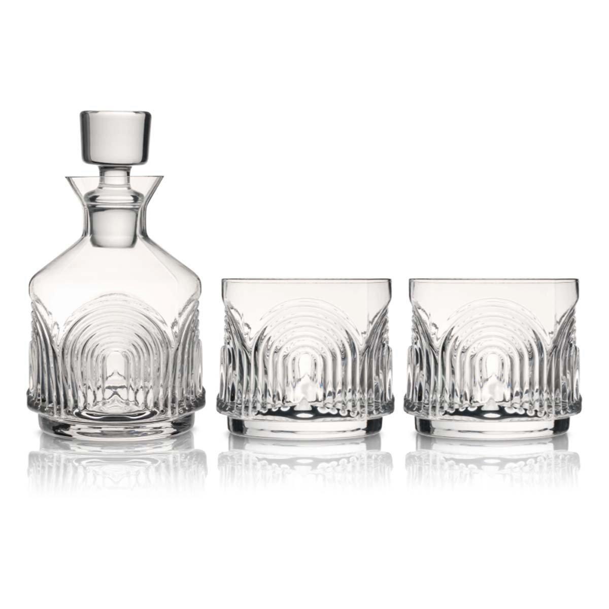 {"reviews":[],"offset":0,"limit":10,"total":0}"Full Description:\nA repeating rainbow motif pressed into lead-free crystal gives these textured tumblers Art Deco decadence. Paired with a matching petite liquor decanter, this stackable barware saves space on your bar cart and adds some Gilded Age style to your glassware collection.\n\nFeatures:\n\u003cul>\n\u003cli>Quantity: 2 glasses, 1 decanter\u003c/li>\n\u003cli>Materials: Lead-free crystal\u003c/li>\n\u003cli>Capacity: 11 oz. glasses, 14.5 oz. decanter\u003c/li>\n\u003cli>Care: Dishwasher Safe\u003c/li>\n\u003c/ul>\n\n"
