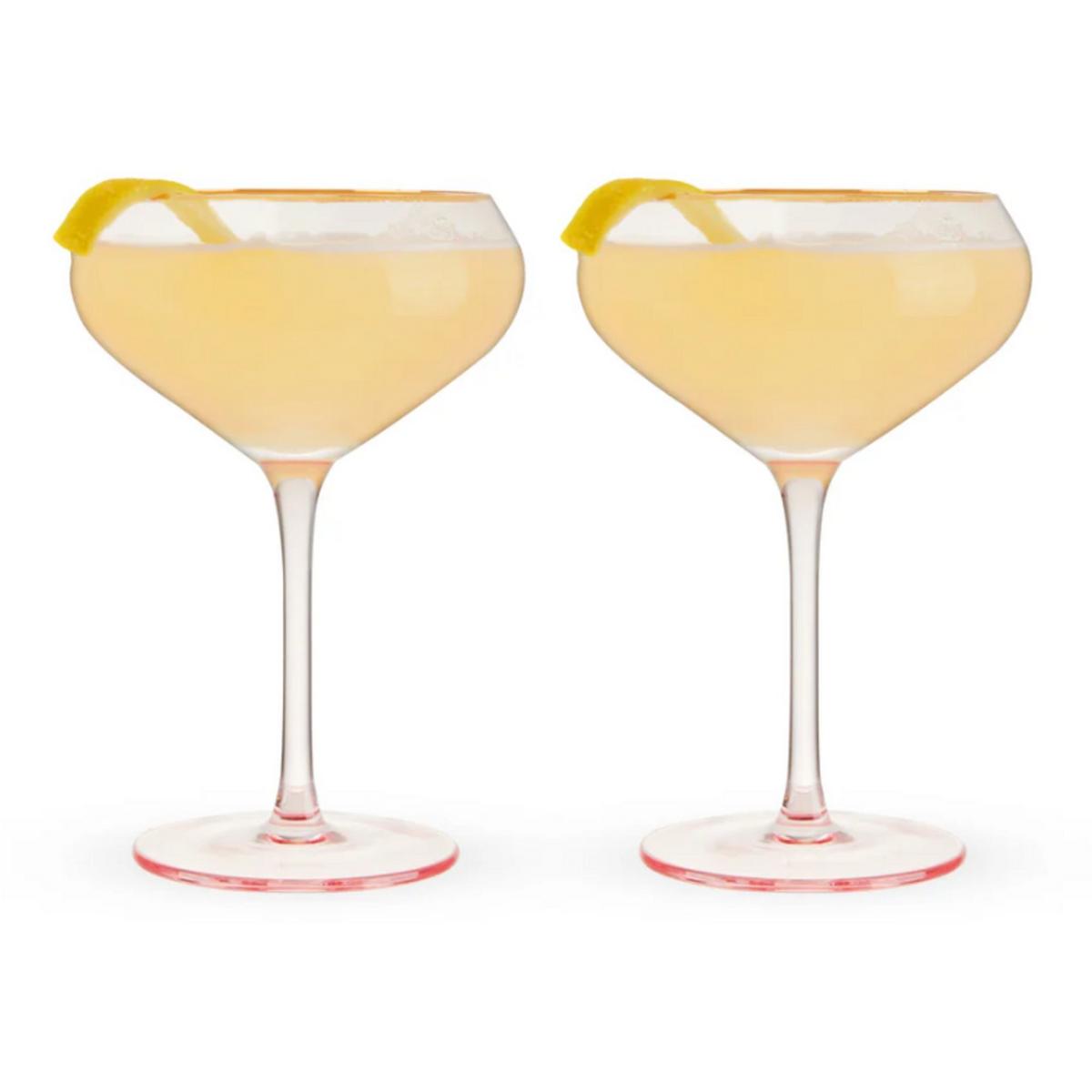 Life looks a lot rosier when you sip from these gold-rimmed coupe glasses. Tinted a delicate pink, these crystal glasses are the perfect vessels for your favorite cocktail.