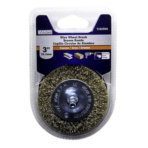 The Vulcan Coarse Grade Wire Wheel Brush is made with tough, durable carbon steel wire. Usage for removal of paint, rust and scale on wood, metal and plastic.