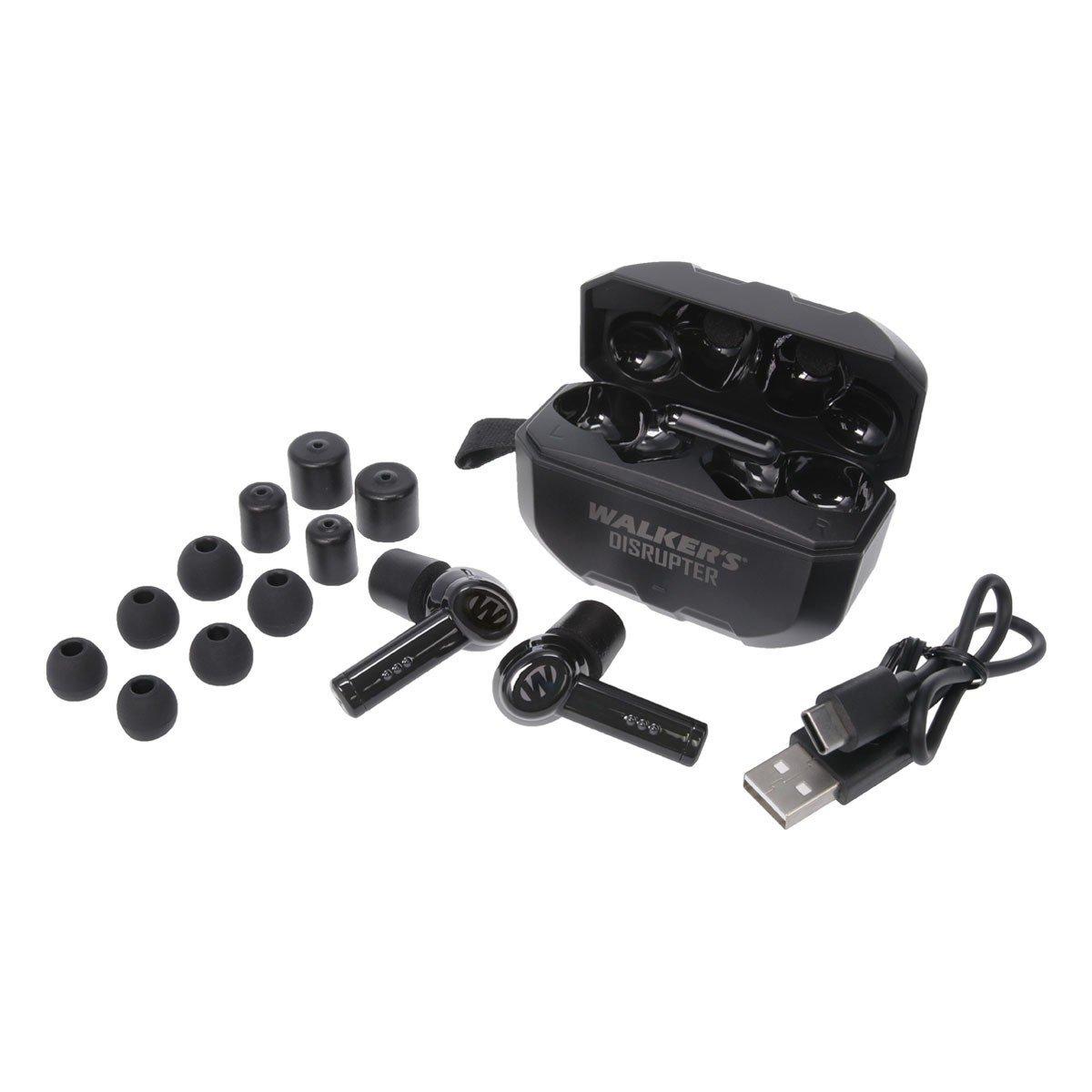 The Disrupter earbuds come in a rugged USB charging case with assorted ear tips. The battery charge lasts up to six hours when Bluetooth streaming or up to 11 hours when used in ambient mode. Two styles of in-ear tips are included with the Disrupter earbuds. Three different sizes of noise-reducing foam ear tips allow for a custom fit and are intended for use when hearing protection is the goal. For general sound enhancement use, such as entertainment or communication, the included silicone in-ear tips can be used.