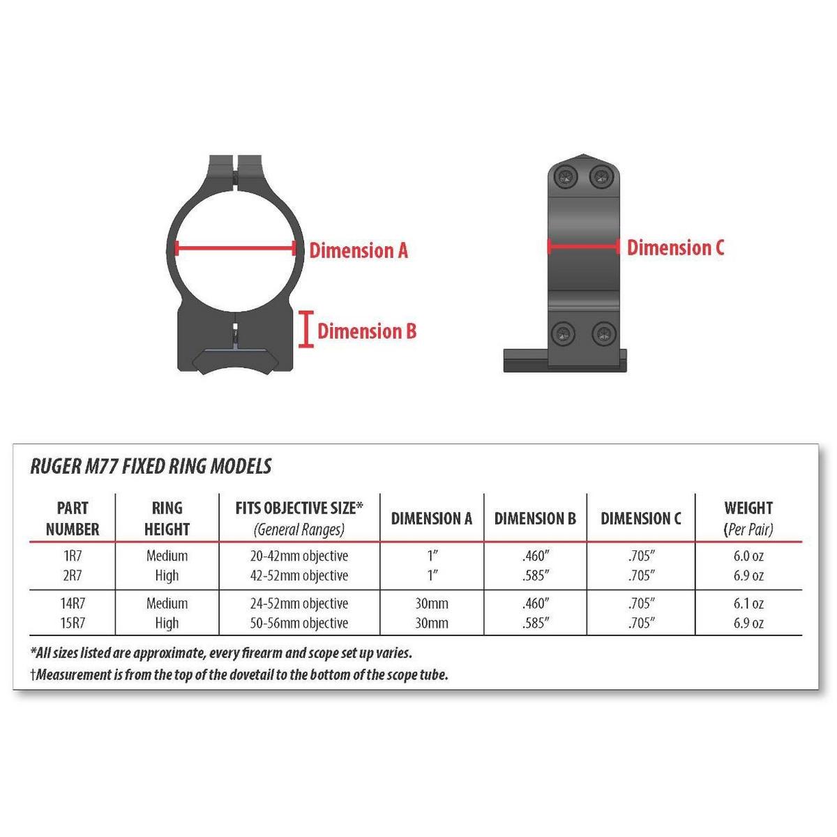 The Ruger Fixed Rings are available in two different styles to fit either the Ruger #1 receiver design (which includes the Blackhawk and Mini 14 models) or to fit the tapered receiver style like the Ruger M77, Hawkeye & Super Redhawk. The Ruger M77 style rings are packaged as two different heights to accommodate the tapered mounting surface on this firearm. Lastly, the Ruger Fixed Rings utilize 4 T-15 Torx style socket cap screws for secure and permanent optics mounting.
