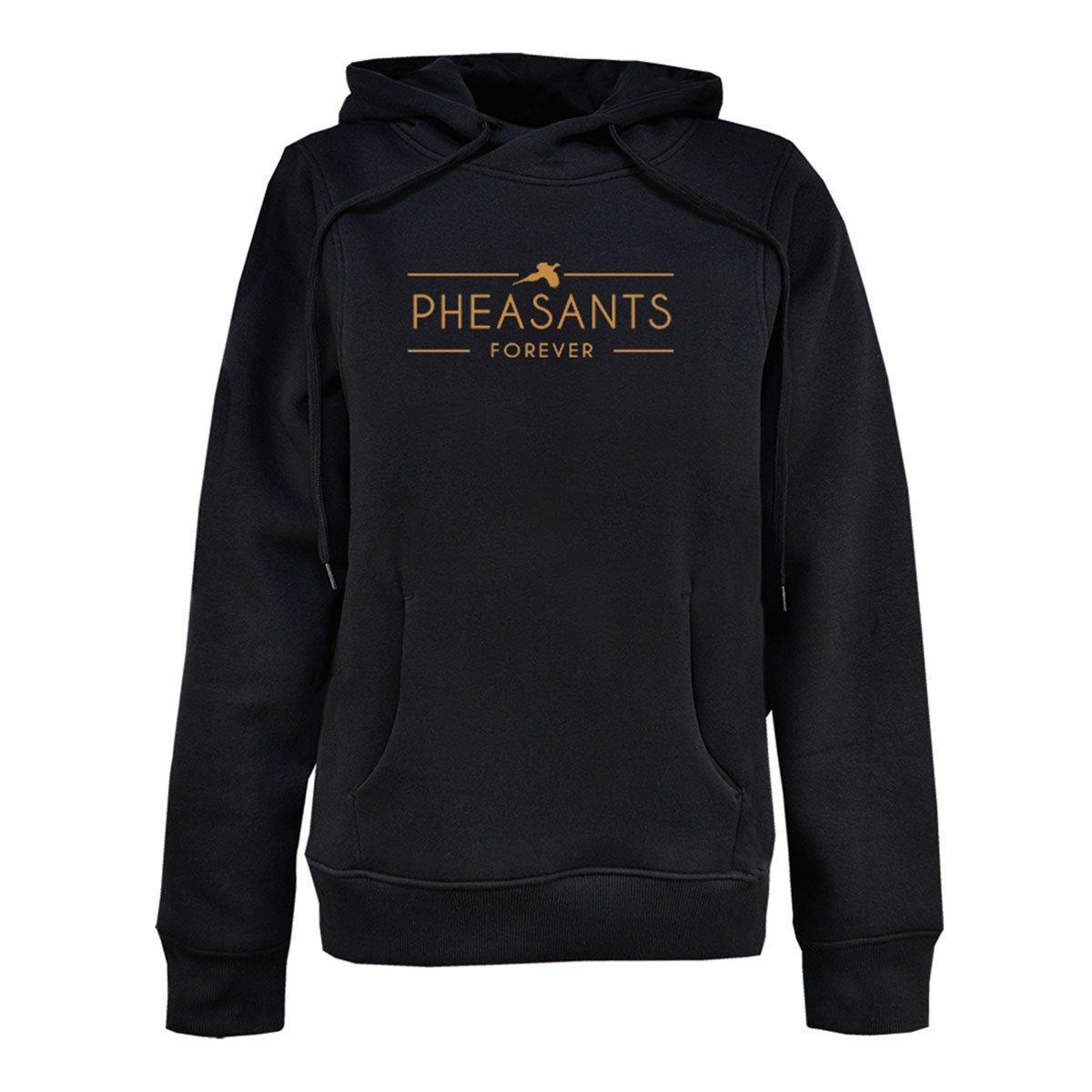 Seoul sleeves, inset kangaroon pocket. Ribbed cuffs and bottom band. Lined hood and pocket. Cotton / polyester fleece blend, 7.6 oz. Front metallic look pheasants forever graphic. Dropshipped from artisans. Made to order. Please allow 10 days after order received to ship product
