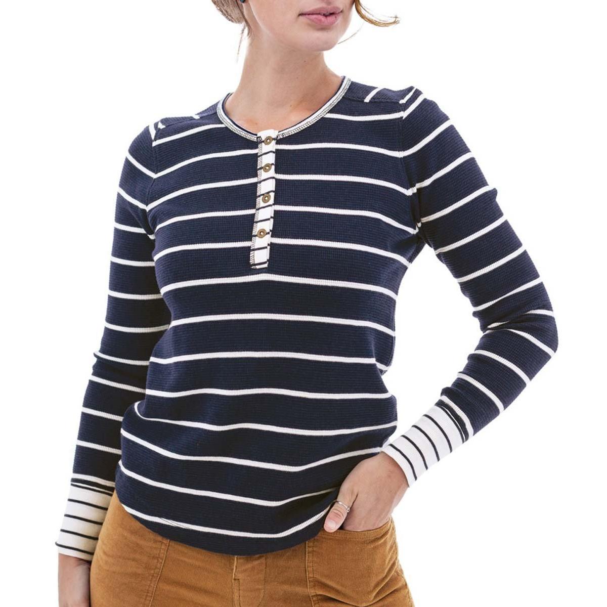 The Fair Trade Certified™ Nicole Henley is a cozy waffle knit top perfect for staying warm as the weather cools. Crafted from sustainable fibers - organic cotton and TENCEL™ Lyocell - this long sleeve is as light on your conscious as it is your body! Together, these fibers create a soft and breathable thermal top with the perfect amount of stretch. We love waffle knits for winter because of their enhanced ability to regulate temperatures; they allow for excellent airflow without allowing cold winter air to directly attack your skin. Plus, they have an ultra-cozy feel! Polished with a coordinating stripe at the cuff, neck and placket's ribknit trim, this top is an attractive option for keeping warm this winter.