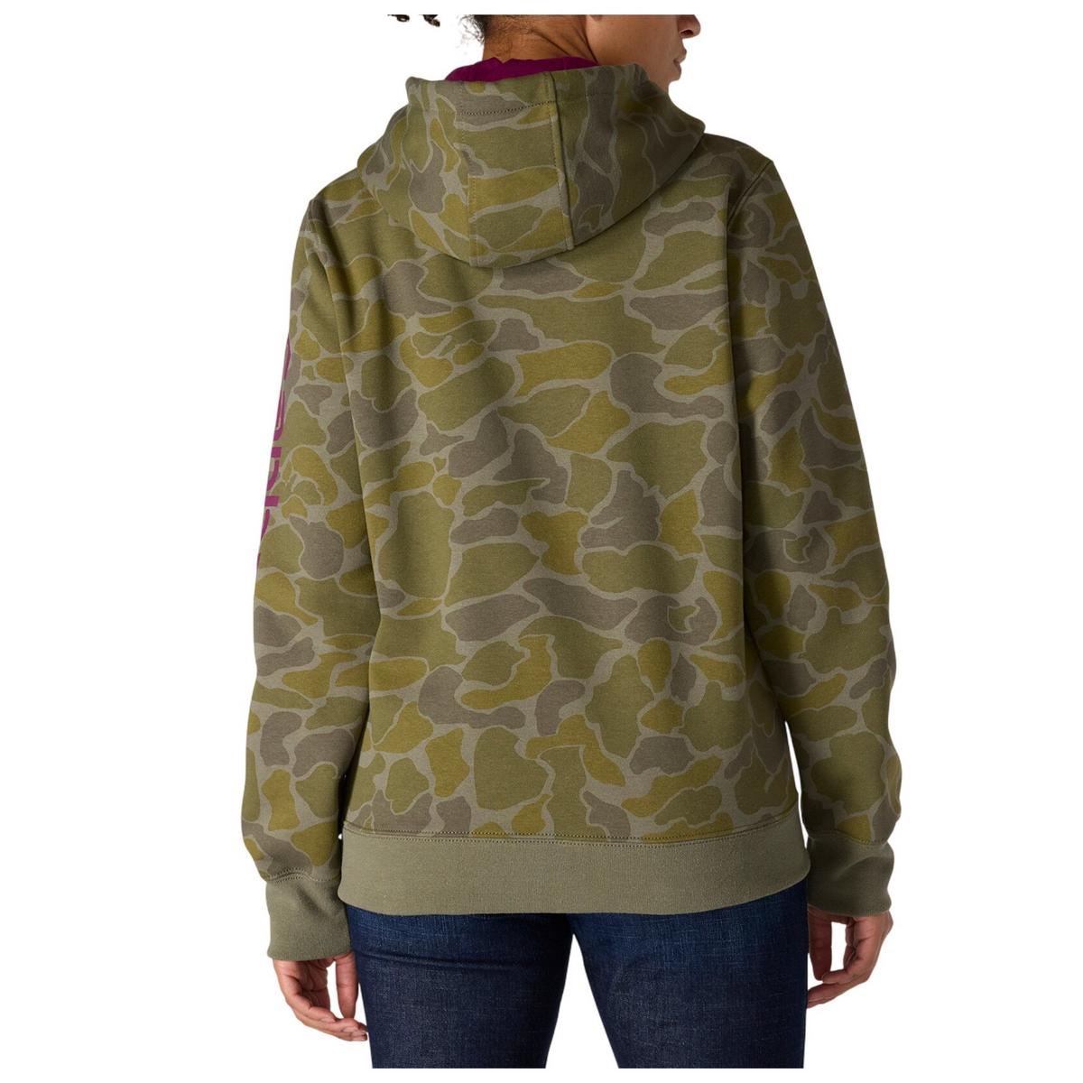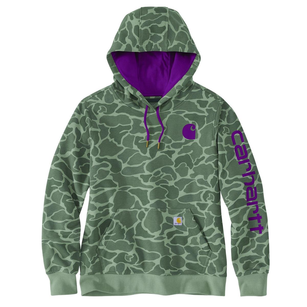 Cold winter mornings are a lot more comfortable with the Women's Carhartt Clarksburg Graphic Sleeve Hoodie. Made of heavyweight fleece, this cozy sweatshirt is brushed on the inside for extra softness and provides reliable warmth. It features a relaxed fit that allows for easy layering over other shirts. A three-piece hood with a drawcord offers adjustable protection, and rib-knit cuffs and waist help keep out the cold. Finished with a practical front pouch pocket and a prominent Carhartt logo printed down the sleeve, the Carhartt Clarksburg Graphic Sleeve Hoodie is a functional and comfortable essential for everyday cold-weather wear.