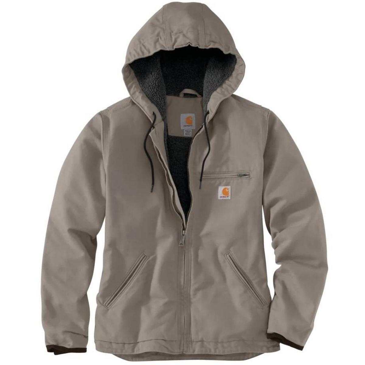 The Women's Carhartt Sherpa-Lined Jacket offers a durable design and reliable warmth for cooler temperatures. Lined with sherpa fleece, this women's Carhartt jacket is super soft, cozy, and warm. Plus, the ribbed knit wrist cuffs and attached adjustable hood help to trap and retain heat even better to maximize warmth on a colder day. For a greater range of motion while working, this women's Carhartt jacket features a pleated bi-swing back and pleated elbows. Stay comfortable and warm in the Women's Carhartt Sherpa-Lined Jacket.