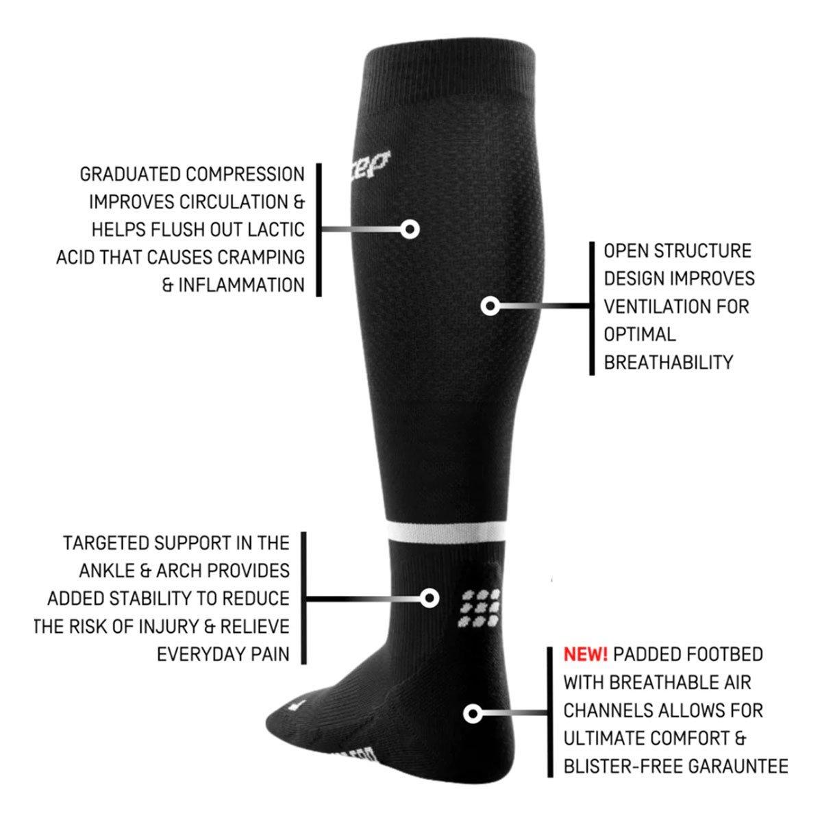 CEP’s Run Tall Compression Socks 4.0 incorporate all the benefits of our best-selling 3.0 Tall Compression Socks, but with even more technological advances to help you elevate your performance. This redefined compression profile is more precise to effectively activate the nutrient supply in your feet and calves, making your legs feel stronger and lighter. Mesh-like structure on the calves, innovative air channels in the footbed, and ventilation zones in the toe provide additional breathability and ultimate comfort.