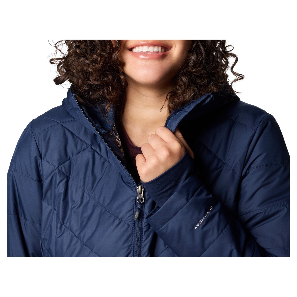 The Women's Columbia Plus Size Heavenly Long Hooded Jacket provides lasting warmth in a style that flatters your figure. This Columbia Heavenly Long Hooded Jacket is complete with thermal reflective Omni-Heat™ that captures your body heat for warmth. The longer style of this plus size winter coat will keep the cold draft from coming in, while the water-resistant shell repels moisture. With a comfort cuff and thumbholes to keep the chill away, the Women's Columbia Plus Size Heavenly Long Hooded Jacket will be your new favorite winter staple.