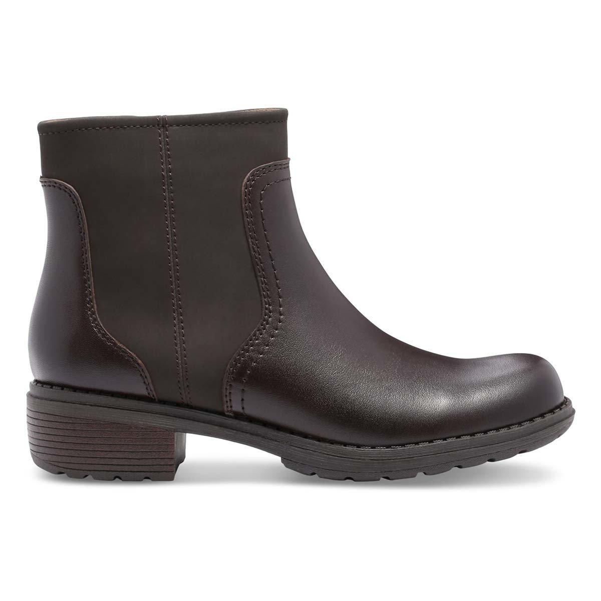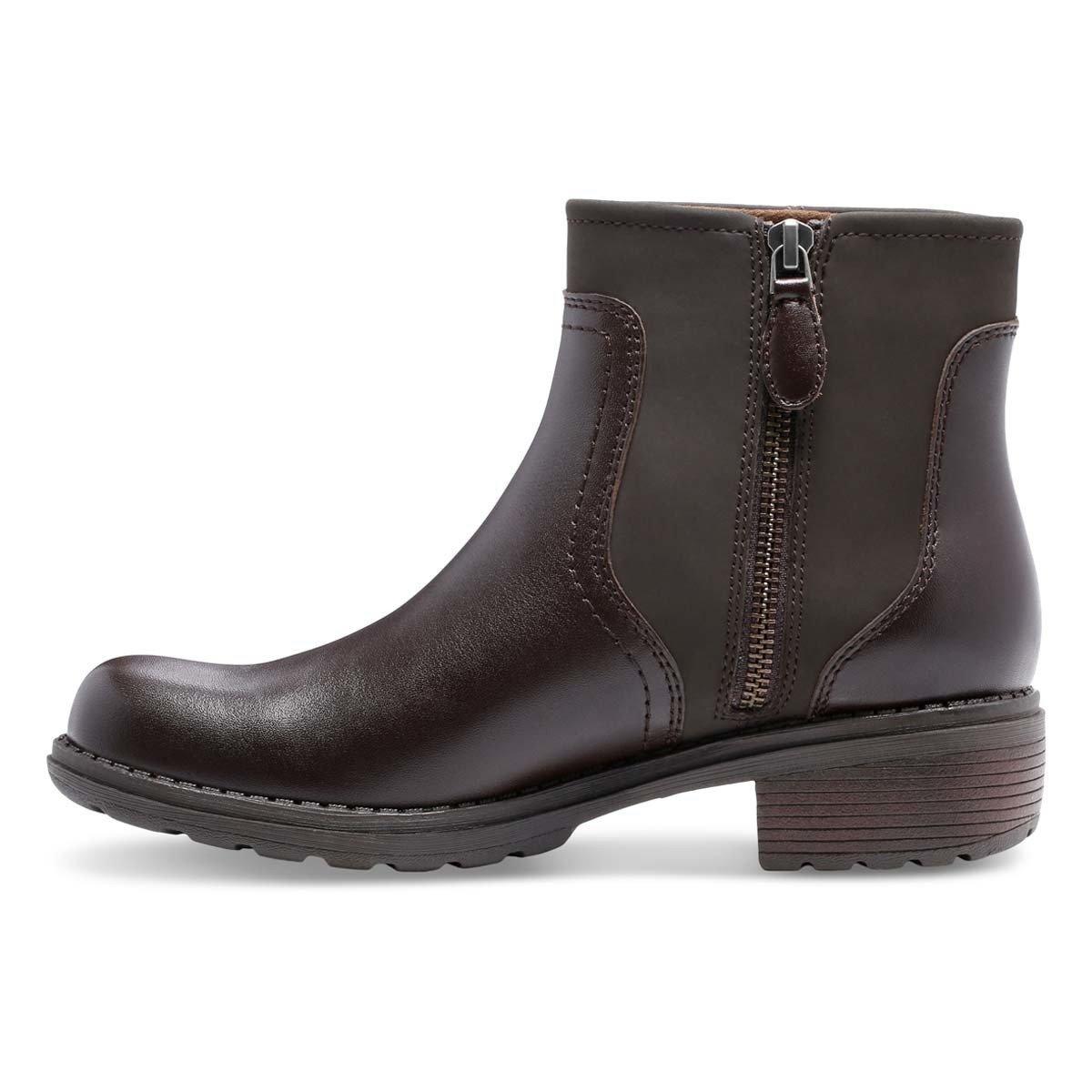 Our Meander boot is detailed with Western-inspired tonal stitching. Inside zipper allows for easy on and off. Full grain leather upper and breathable fabric sock lining. Cushioned insole eases you into every step. Shock absorbing and flexible TPR rubber outsole for great comfort, slip resistance and durability. Boot Height: 4 3/4". Heel Height: 1 1/2".