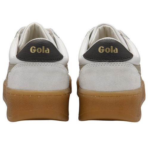 Gum soles are having a moment and Grandslam Elite takes the sneaker trending look up a notch. The much loved Grandslam vintage tennis upper is complemented with the perfect gum tone sole and a classic colour palette of white with black Gola wingflash branding. A chalk pink heel pop adds a joyous twist to give a heritage women’s sneaker with a sunny disposition.