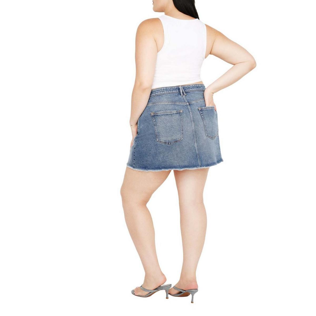 High-rise Front zip-fly closure Classic 5-pockets Gap-proof waistband Reinforced belt loops Tummy smoothing technology Frayed hem Mini length Medium blue wash