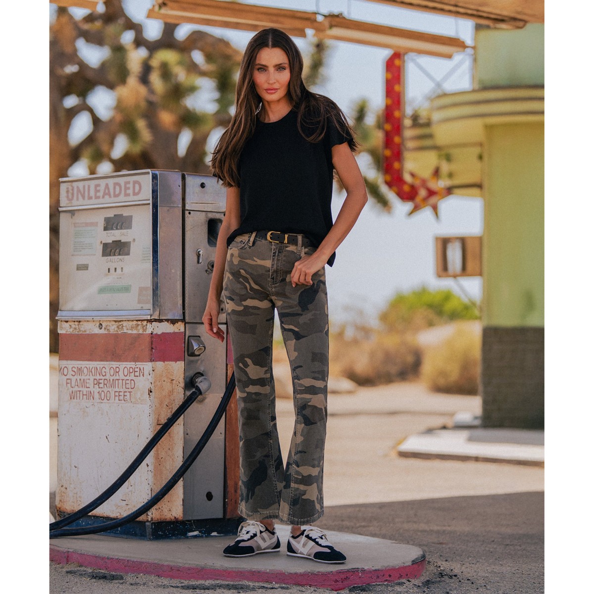 Step into bold with these high rise kick flare camo pant. Designed to sculpt at the waist and flare at the hem, they blend street style with all-day comfort.