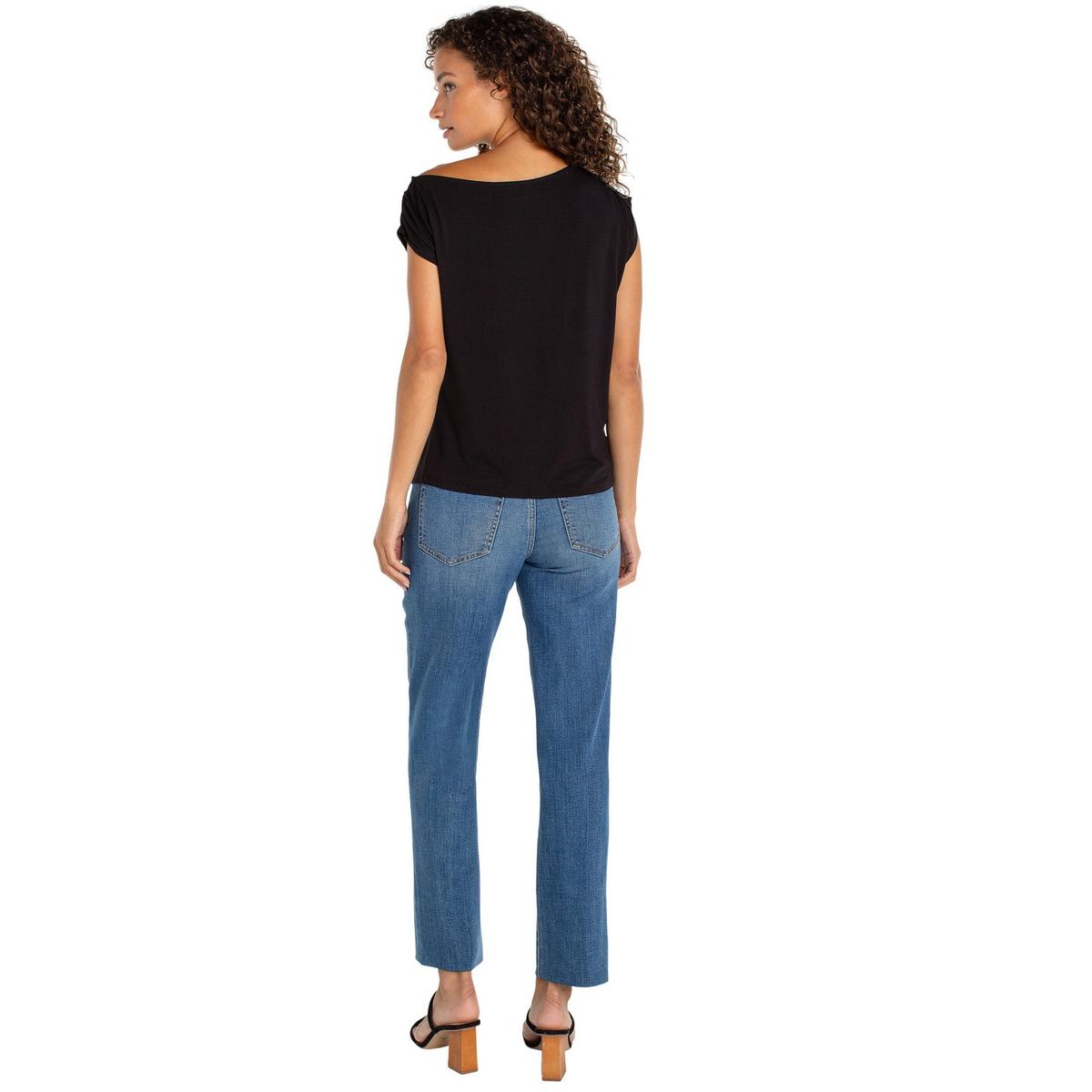 An asymmetric neckline gives this knit top a playful twist. Short sleeves, gentle shirring, and a smooth straight hem create a look that feels feminine, modern, and effortlessly put together.