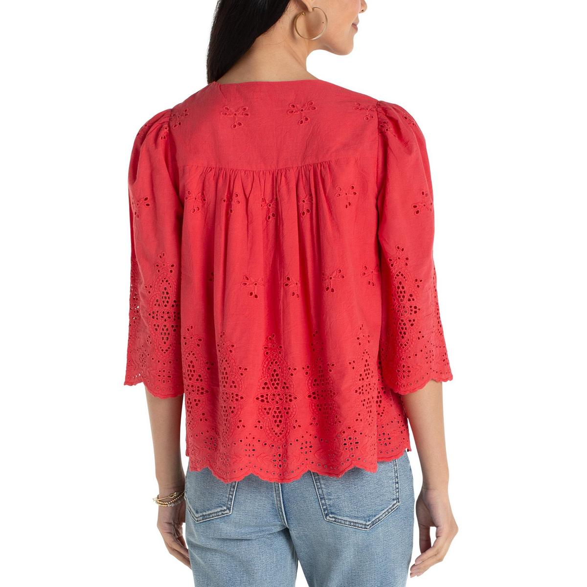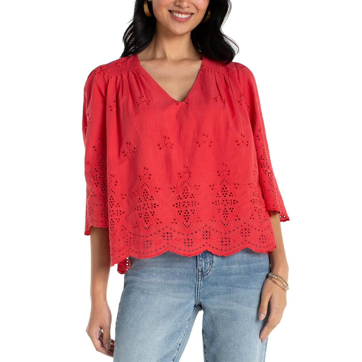 Women's Liverpool Los Angeles Eyelet Woven 3/4 Sleeve V-Neck Shirt