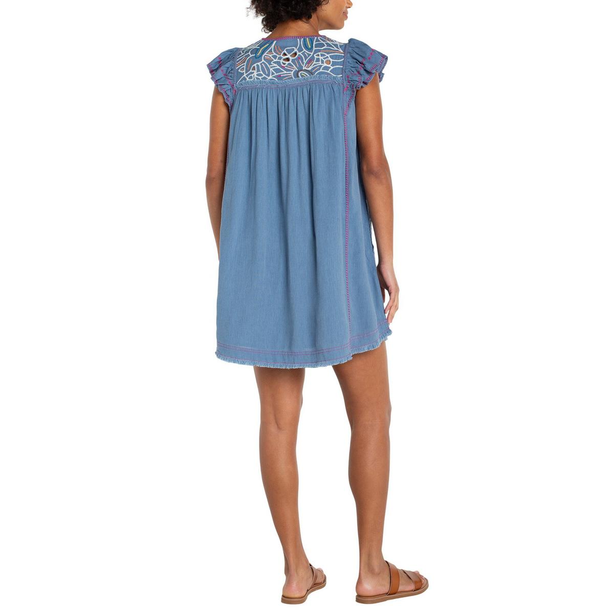 Feminine and effortlessly chic, this woven dress features flutter sleeves, a flattering V-neckline, and delicate embroidery along the neckline for subtle texture and charm. Perfect for daytime events or evening outings with a polished touch.