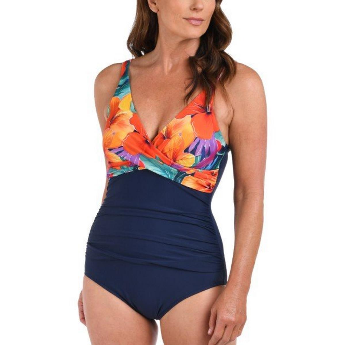 Embrace a blend of elegance and vibrancy with this black one piece adorned with striking fuchsia flowers, creating a captivating contrast that adds a pop of color and femininity to your swimwear. The wrapped V-neck accentuates the bustline while molded cups and wide adjustable straps provide comfortable lift and support. A built-in tummy toner slims and smooths the silhouette.