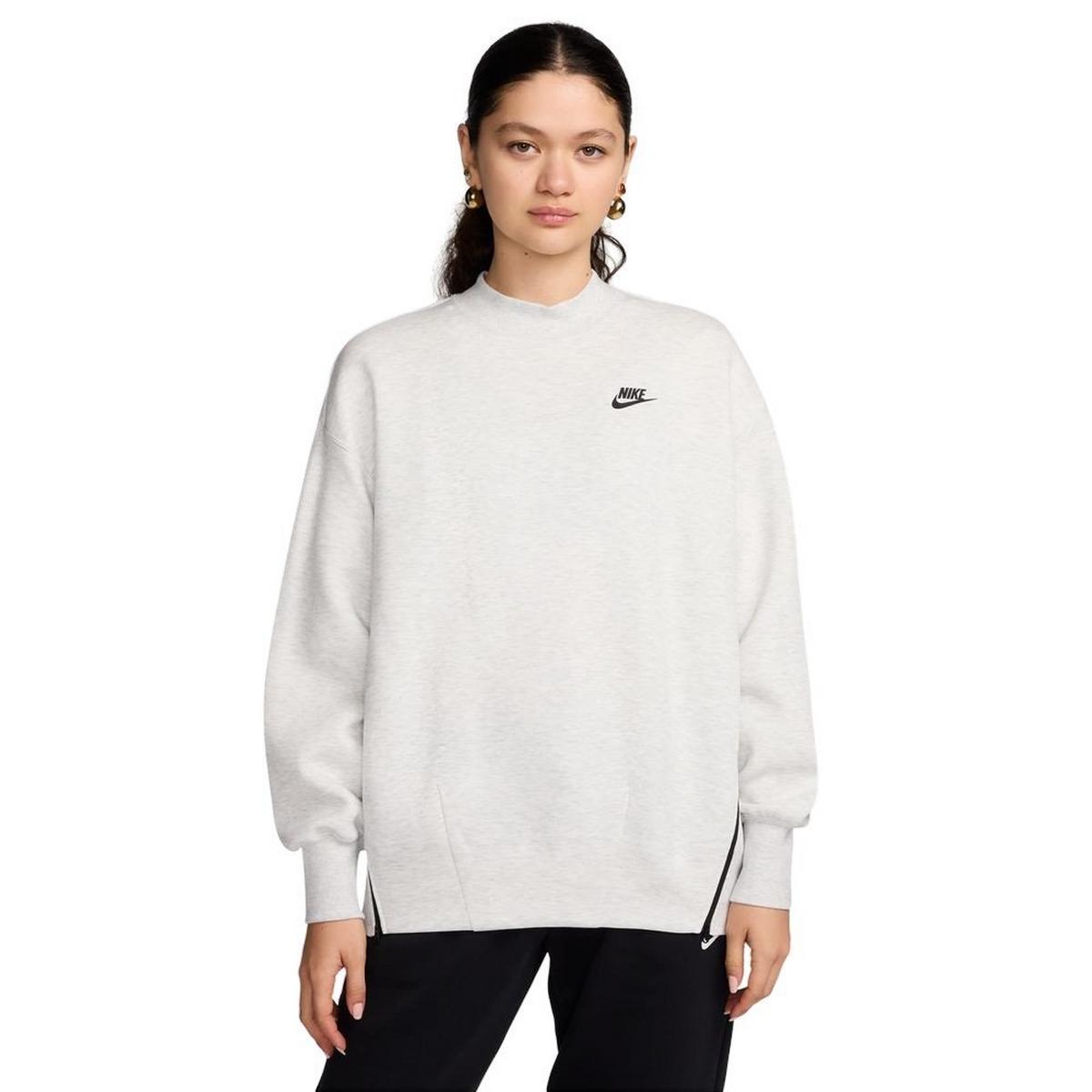 Stay cozy and stylish in the Women's Nike Sportswear Tech Fleece Crewneck Sweatshirt. Made with premium, lightweight fleece that's smooth inside and out, this sweatshirt delivers all-day comfort in a sleek design. Dropped shoulders and an oversized fit provide a relaxed, modern look, while ribbed cuffs and neckband add a polished finish. The printed Futura logo adds a signature Nike touch, and zipper details with hem darts introduce textural variety and visual interest. Whether layering or wearing solo, the Women's Nike Sportswear Tech Fleece Crewneck Sweatshirt is a perfect blend of sporty vibes and everyday versatility.