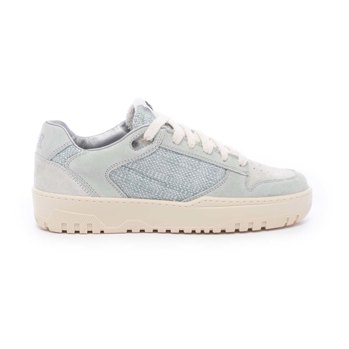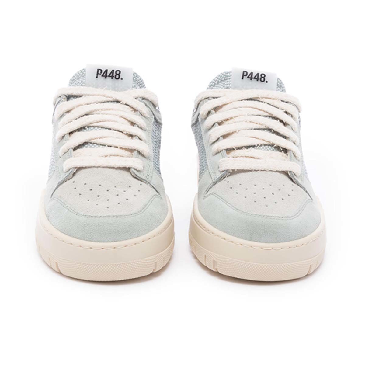 Made in italy. Mint and white fabric upper and tongue. Light grey suede toe & heel tab accent. Mint suede trim & heel tab. Terry cloth lining with silver leather accent. Memory foam- oike insole. P448 rubber insolw. White cotton laces.