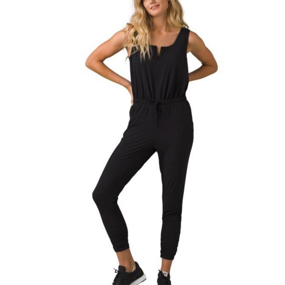 The Women's prAna Railay Jumpsuit is the perfect choice for an active lifestyle. This jumpsuit is crafted from a stretch performance woven that is lightweight and comfortable, while still offering UPF 50+ protection and moisture wicking to keep you comfortable and dry. The prAna Railay Jumpsuit features a scoop neck sleeveless silhouette with a center front zipper and bottom leg ruching for a flattering fit. Plus, the gathered waistband with an adjustable drawcord gives you the freedom to customize your look. You can store your essentials with the two front-hand pockets, a back welt pocket at the wearer's right, and a hidden zip pocket at the wearer's left side seam. This jumpsuit is the perfect mix of style and comfort for any outdoor activity.