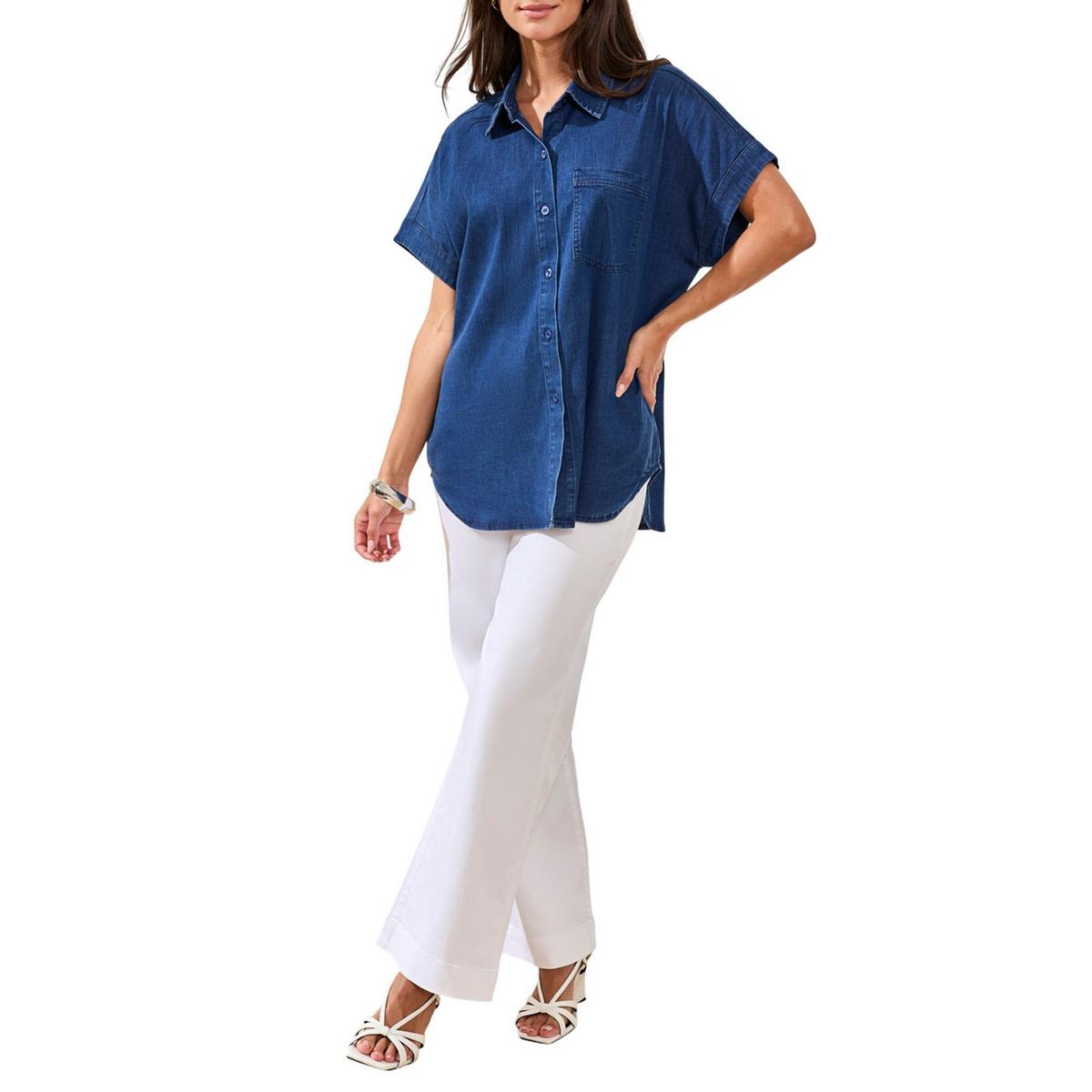 The flowy short sleeve denim campshirt is made from super stretch soft flowy denim for an ultra-soft feel and draped movement. The relaxed fit, chest pocket, and open collar add a laid-back vibe, perfect for casual spring styling or layered with your favorite joggers and shorts.