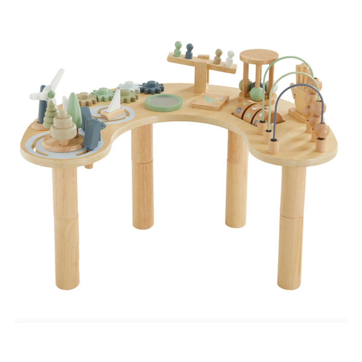 Get your kiddo moving with our Hi-Lo Activity Table. This beautiful activity table has numerous different games and toys for your little one. Includes lake maze with sailboats, sea serpant and trees, spinning gears, acrylic mirror, windmill, peg people balancing toy, ball cage, rolling shape and color matching game, bendable counting fingers, peek-a-boo door, and bead abacus. Best of all, the legs can be adjusted with a quick screw in/screw off twist to accommodate both sitters and standers. Table height for sitters is 7.5″h, and for standers, 15.5″h. This table is a must have keepsake!