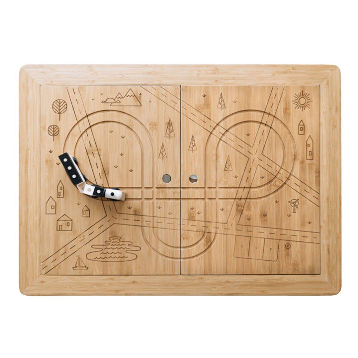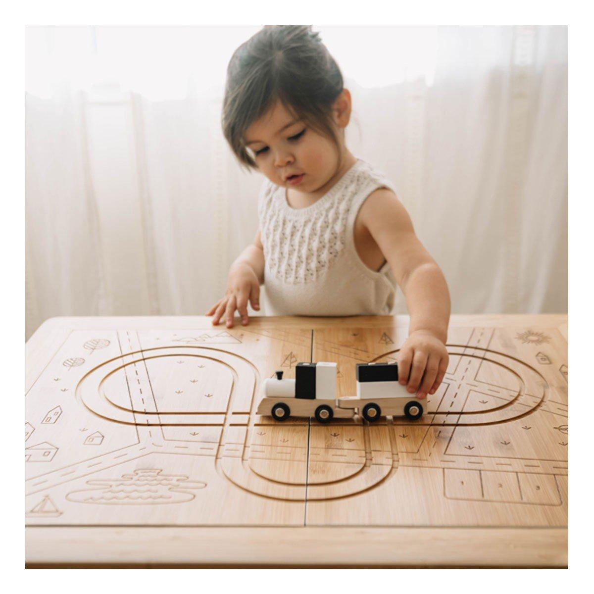 Put it all in the table with our Land, Sand and Water Table. 3 removable, collapsible plastic bins hold everything from sand, water, beans, rice, or whatever sensory fun you can imagine. Comes with two reversible covers; one side is a train track (fits most standard trains), and the other side is a chalkboard. Made of beautiful, sustainable bamboo, this table offers many ways to play. Simple adult assembly. Chalk and trains not included.